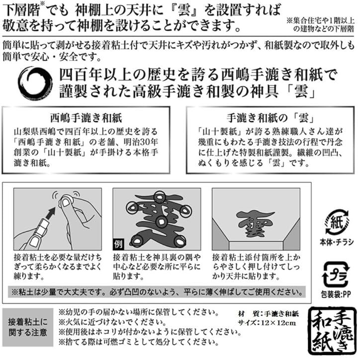 雲 雲字 雲切 神棚 神具 仏壇 仏具 手漉き 和紙 12x12cm 雲切り 文字 日本製 簡単設置 接着粘土付き 手漉き和紙 水晶装飾