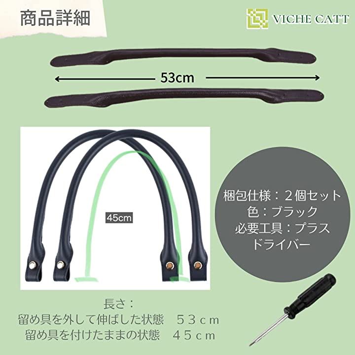 ・「サイズ」 長さ:留め具を外して伸ばした状態 53cm 留め具を付けたままの状態 45cm 色:ブラック 梱包仕様:2個セット 素材:PU革8ポリウレタンレザー 必要工具:プラスドライバー 使用例:ビジネスバックの持ち手だけが痛んだ時や汚れてしまった際にハンドル部分だけ交換可能。または、取手だけ変えて雰囲気を変えてオシャレにアレンジも出来ます。