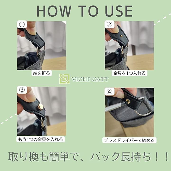 ・仕事用バックやお出掛け用バックの取っ手だけ汚れたり、痛んでしまった。そんな困った時にハンドル部分だけ取り替えることができちゃいます。他にも、バックを少しアレンジしたいなと思ったときに取っ手だけこの商品に変えてバックの雰囲気を変えることができます。