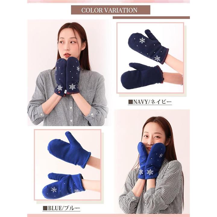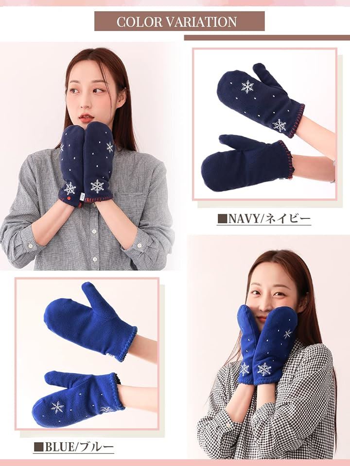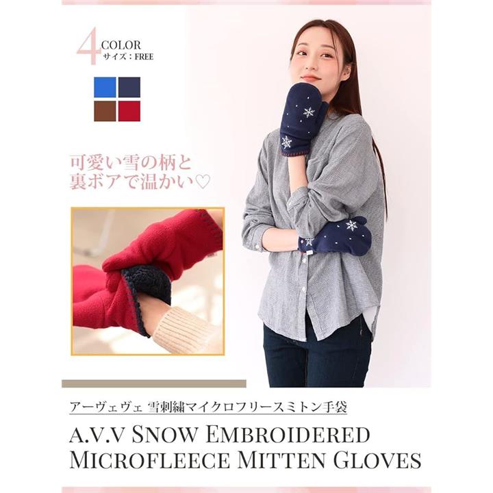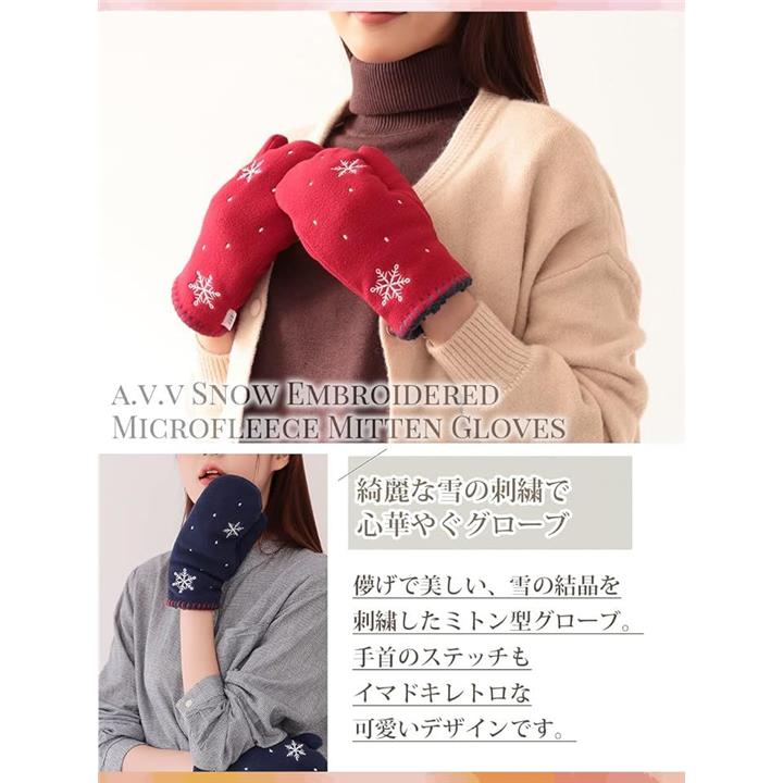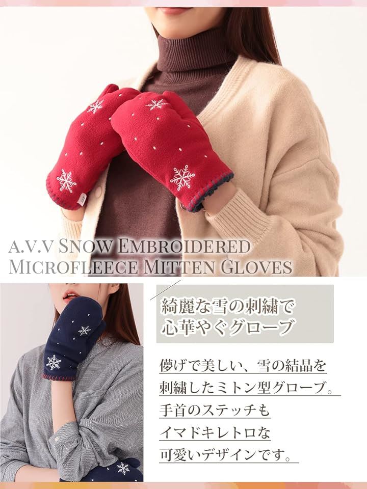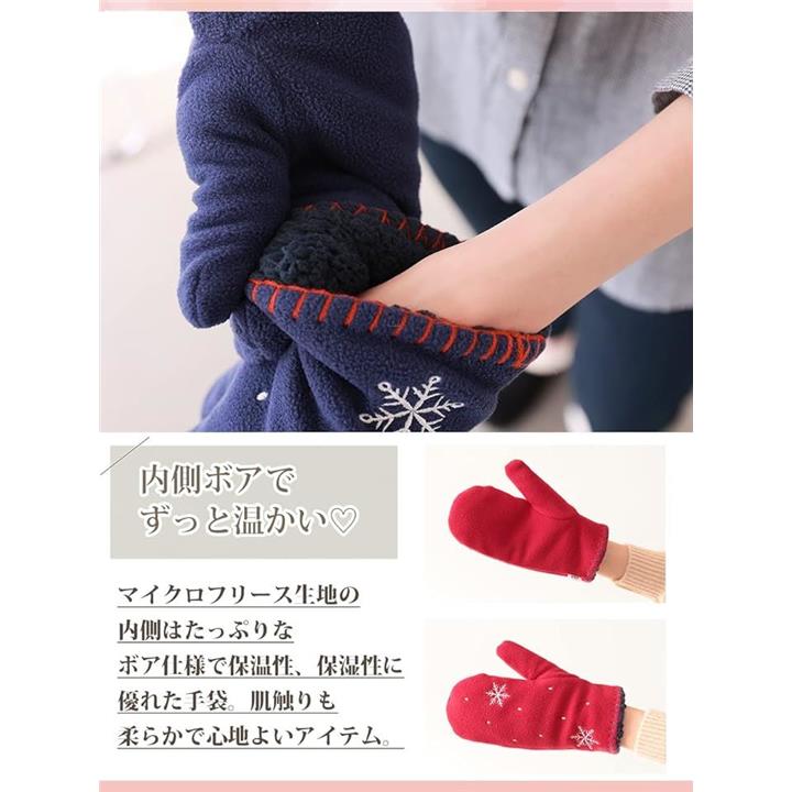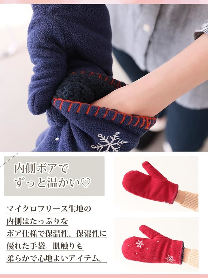 寒さしらずの 裏ボア入り マイクロフリース 可愛い 雪刺繍 ミトン手袋 FREE M-L