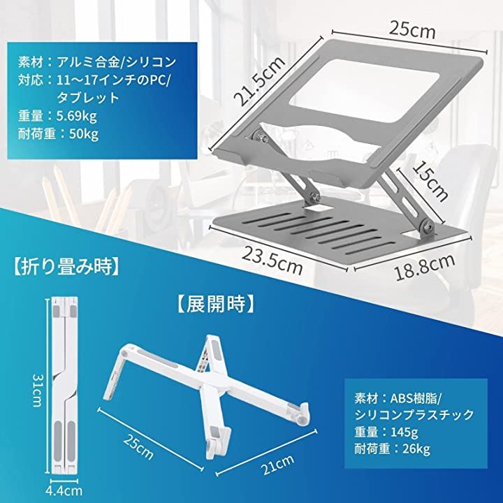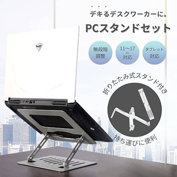 ノートパソコンスタンド セット 2タイプ 使い分け PCスタンド タブレットスタンド PC台 アルミ合金 ABS製 高さ/角度調整可能 軽量 折りたたみ 在宅勤務最適 持ち運び 収納 放熱性 携帯 どこでもPC作業 快適作業性