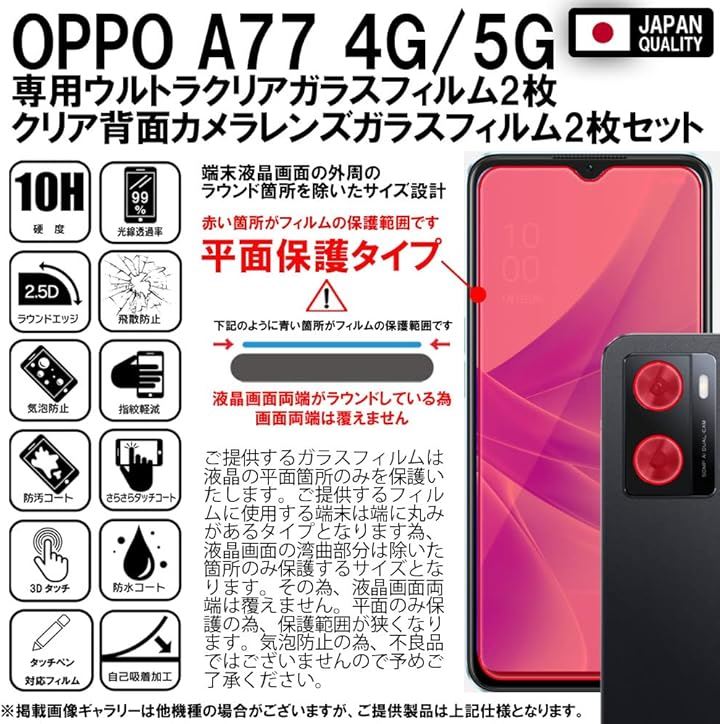 RISE 2枚+2枚 フィルム OPPO A77 4G 5G ガラスフィルム カメラフィルム レンズフィルム レンズ保護ガラス レンズカバー 保護フィルム 強化 高透過 高光沢 日本製 旭硝子 硬度9H 2.5Dラウンドエッジ 自動吸着 気泡ゼロ 飛散防止 指紋防止 撥水撥油 3D