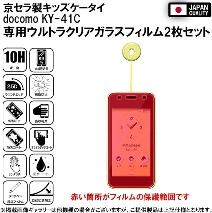 2枚フィルム KYOCERA 京セラ製 キッズケータイ KY-41C ガラスフィルム 保護フィルム 強化 高透過 高光沢 日本製 旭硝子 硬度9H 2.5Dラウンドエッジ 自動吸着