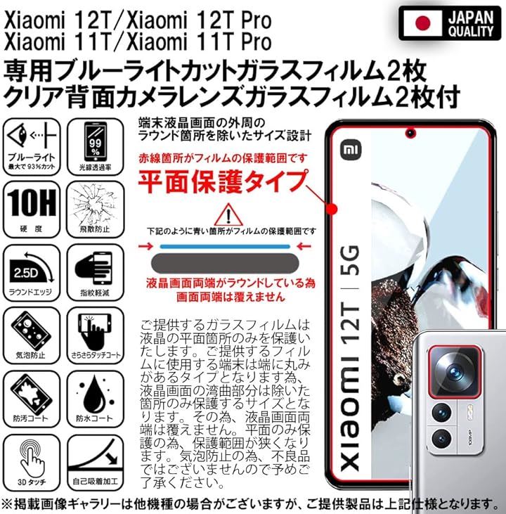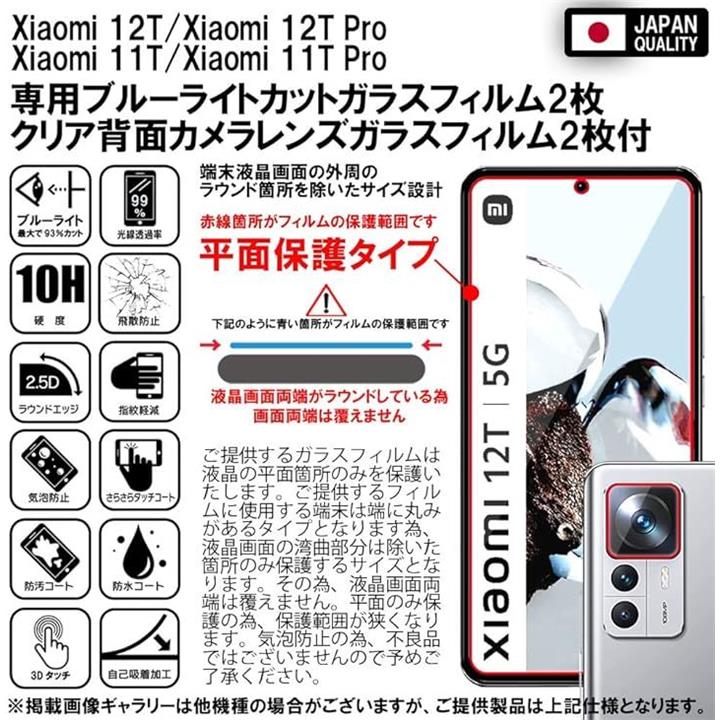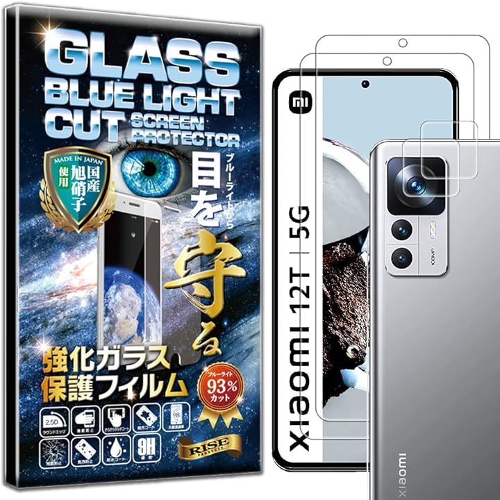 RISE 2枚+2枚 フィルム Xiaomi 12T/Xiaomi Pro ガラスフィルム ブルーライトカット カメラフィルム レンズフィルム レンズ保護ガラス レンズカバー 保護フィルム 強化 高透過 高光沢 日本製 旭硝子 硬度9H 2.5Dラウンドエッジ 自動吸着 気泡ゼロ