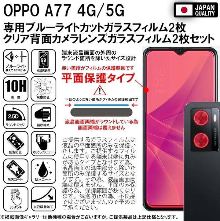 RISE 2枚+2枚 フィルム OPPO A77 4G 5G ガラスフィルム ブルーライトカット カメラフィルム レンズフィルム レンズ保護ガラス レンズカバー 保護フィルム 強化 高透過 高光沢 日本製 旭硝子 硬度9H 2.5Dラウンドエッジ 自動吸着 気泡ゼロ 飛散防止 指紋防止
