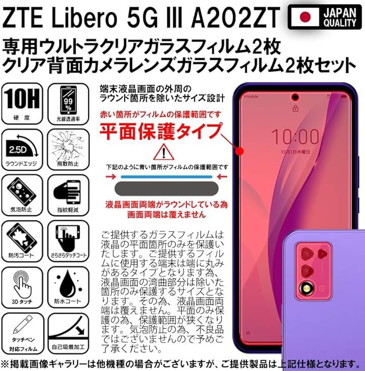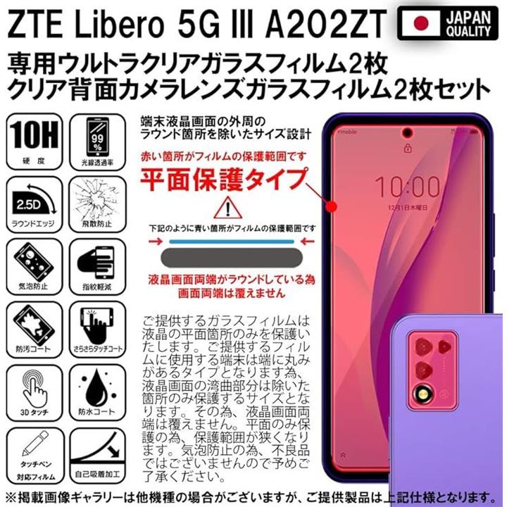 2枚+2枚 フィルム ZTE Libero 5G III A202ZT ガラスフィルム カメラフィルム レンズフィルム レンズ保護ガラス レンズカバー 保護フィルム 強化 高透過 高光沢 日本製