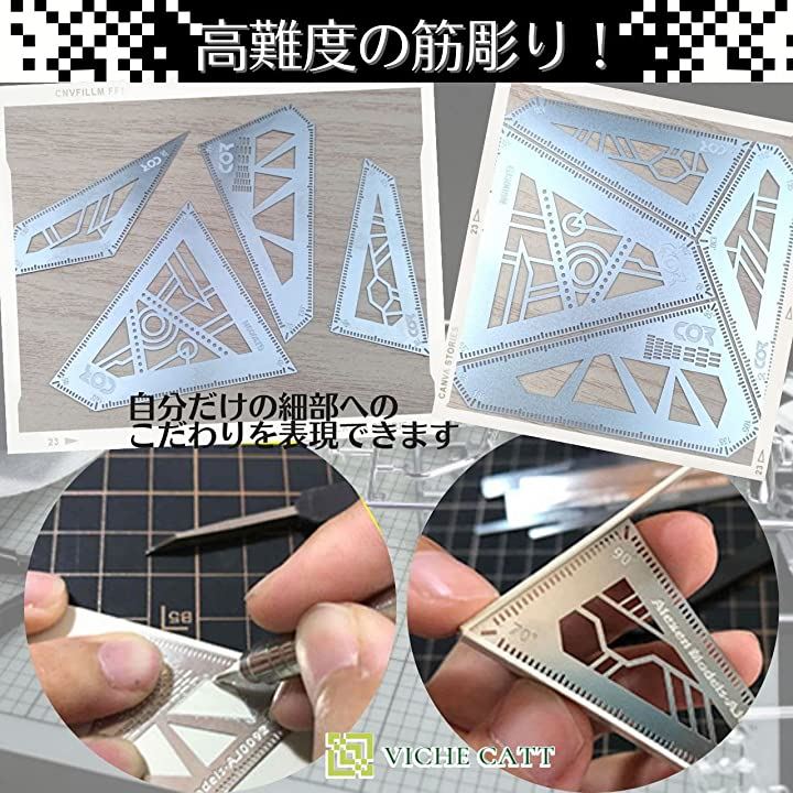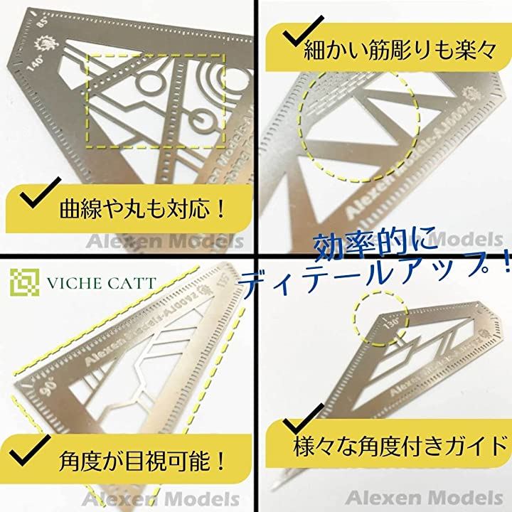 そんな難易度の高い筋彫りが、この「スジボリガイド」さえあれば、簡単キレイに仕上がりますよ。 さらに、ガンプラなど向けに、角度測定機能も付いたテンプレートです。