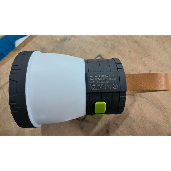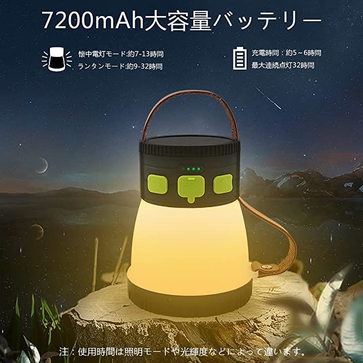 ランタンは7200mAhの超大容量リチウムイオン蓄電池を内蔵し、点灯時間は点灯モードに応じて約7~32時間である。