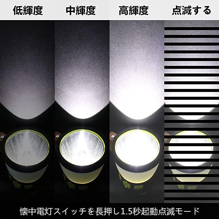 懐中電灯のスイッチを押すと、3つの輝度の調光、低輝度>中輝度>高輝度>off。