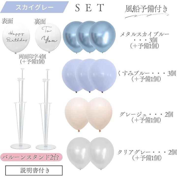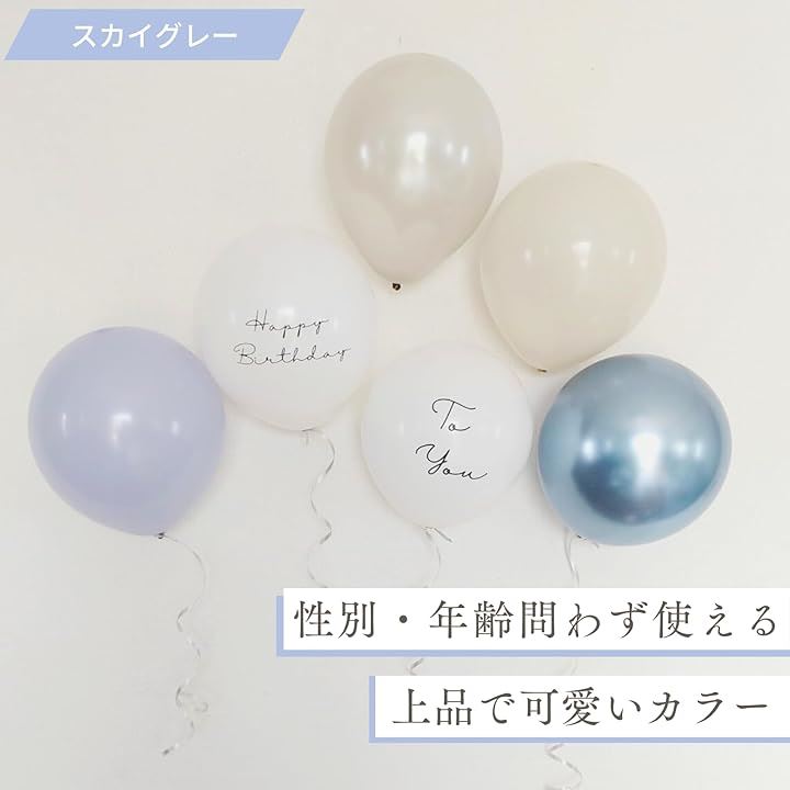 風船は複数の種類が含まれており、メッセージ入りのバルーンや透明感のあるグレーを使用した風船、可愛らしいと人気の透明ドットのデザイン風船が含まれているセットがあります。