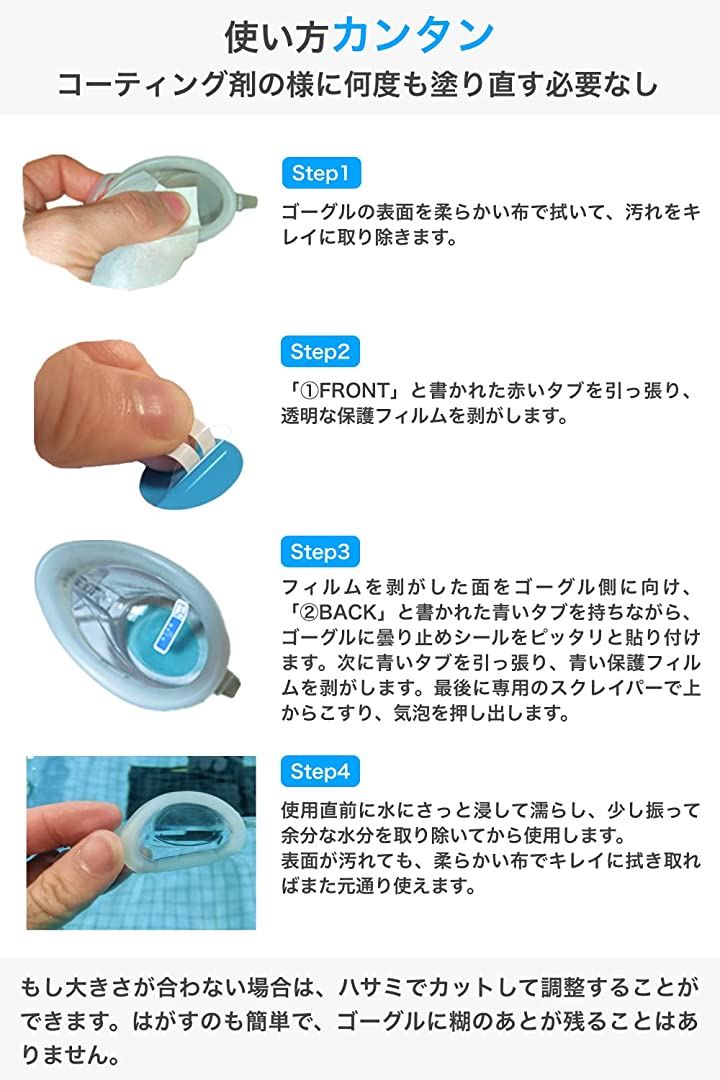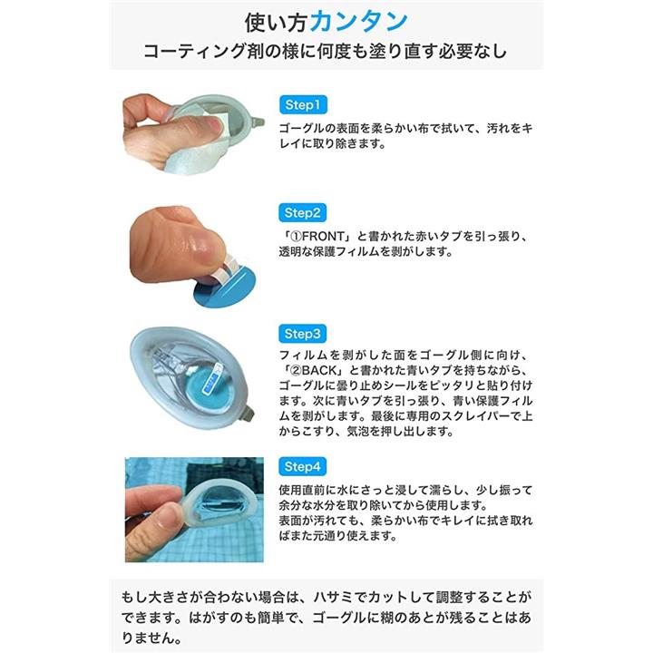 ・「 使い方かんたん 」保護フィルムをはがしてゴーグルの内側に貼り付けるだけ。