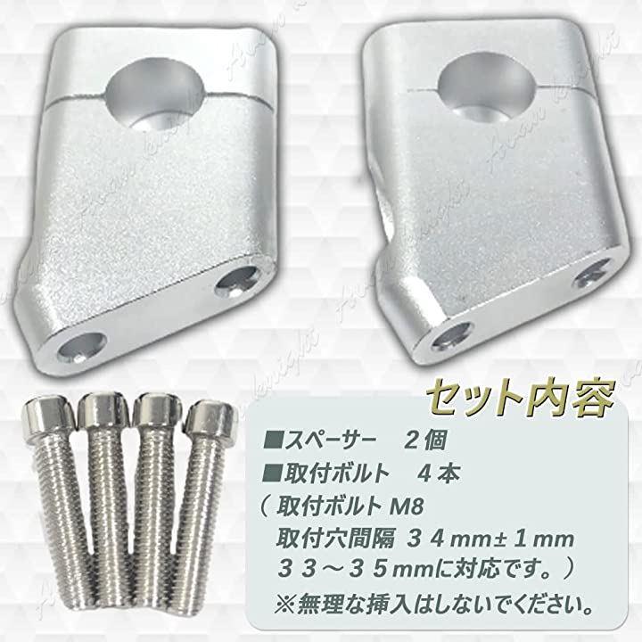 セット内容:アダプターx2 取り付けボルトx4 カラー:ブラック/シルバー 側取り付けボルト:M8 ブリッジ側取り付け穴間隔 34mm+/-1mm 33~35mmに対応です。