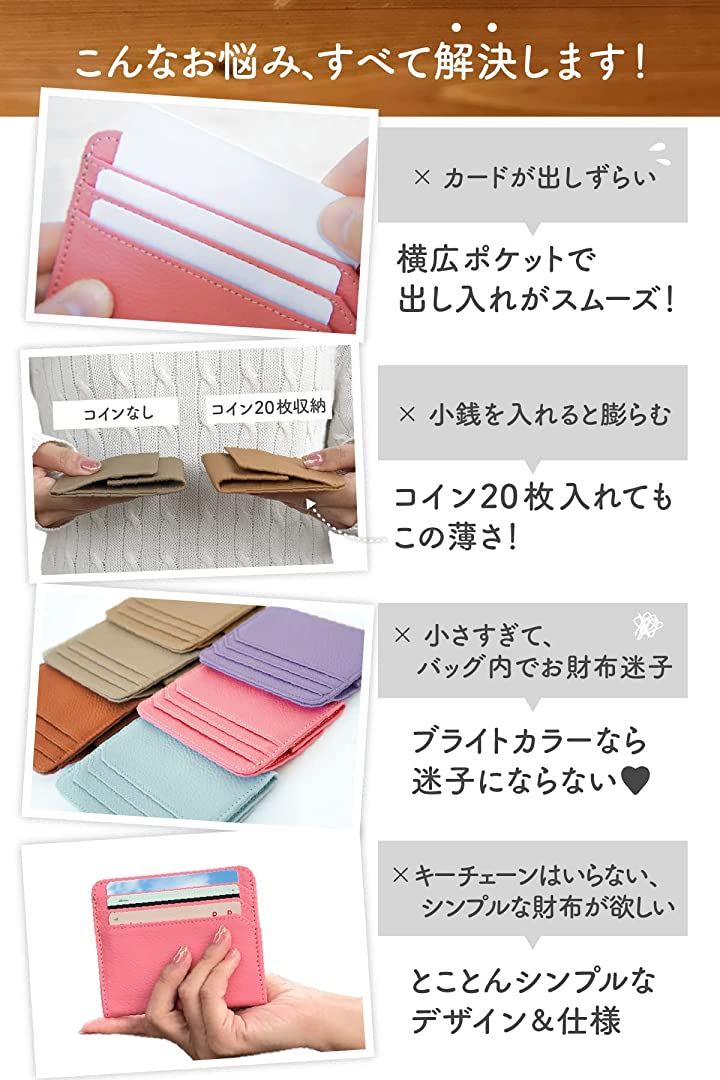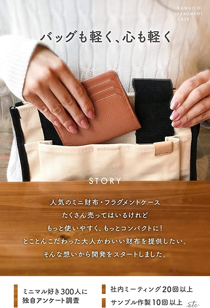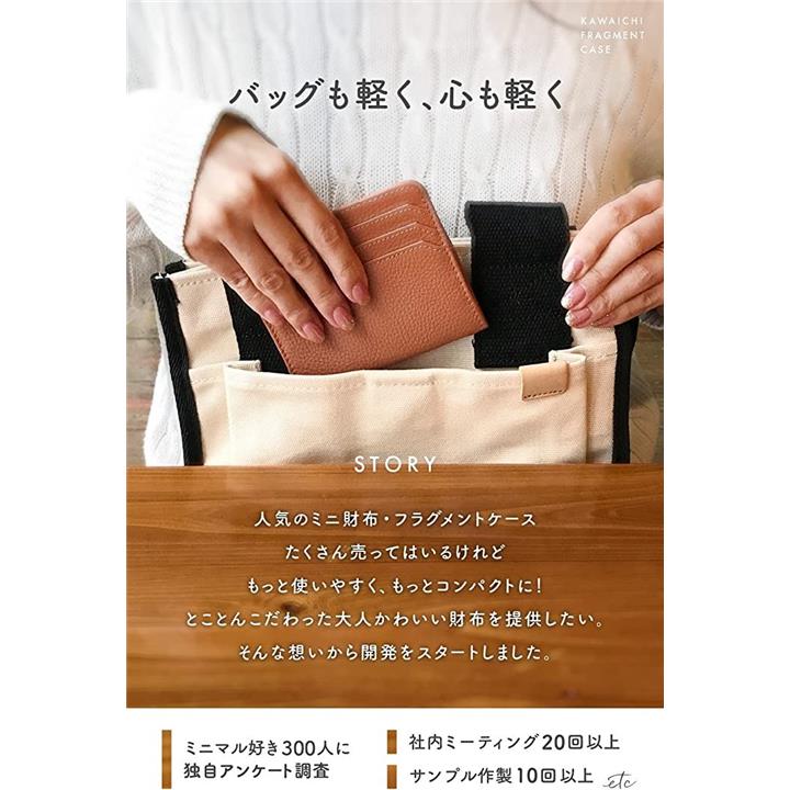 「少ないお札、カード、小銭がコンパクトに持ち歩ける」「ミニバッグでかさばるのがイヤ」「小銭が見づらい(取り出しにくい)」「バッグの中でお財布迷子が困る」「カードをサッと取り出したい」そんなミニマル好き300人の声をもとに開発。