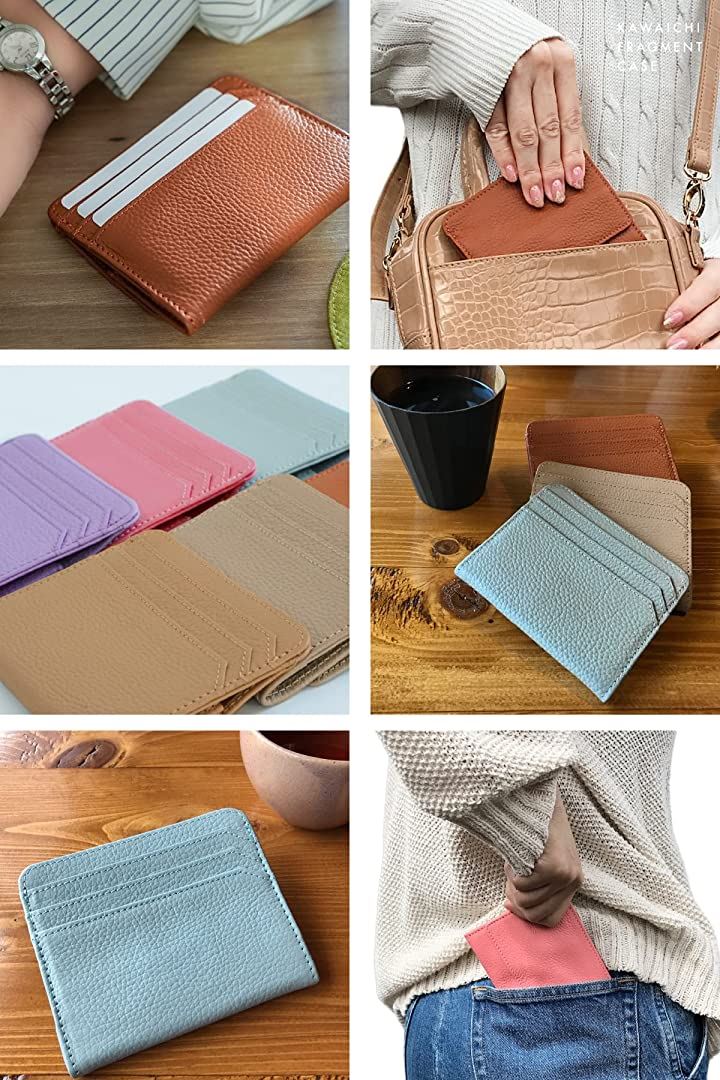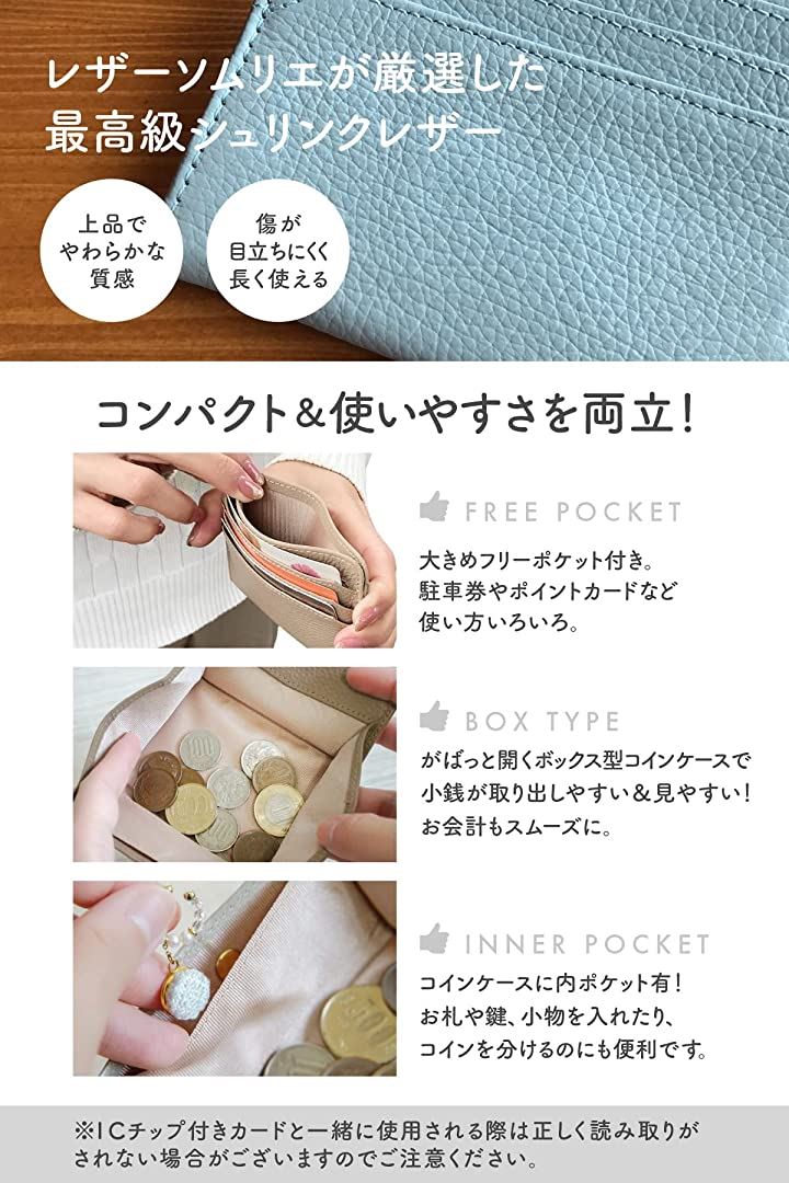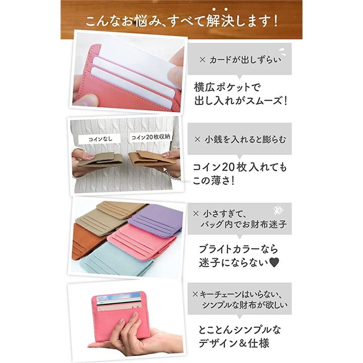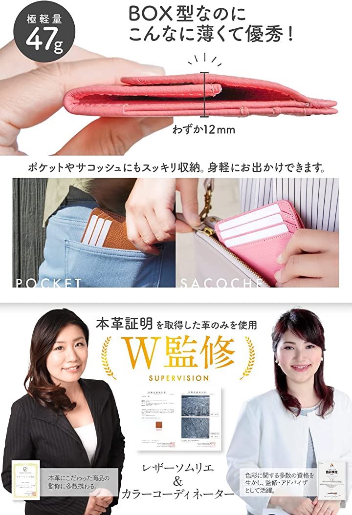 ・「商品詳細」素材:牛本革/シュリンクレザー カラー:グレージュ、ベージュ、キャメル、ライトピンク、ライトブル―、ライトパープル サイズ:10.5cmx9cmx(最小)1.2cm 重さ:約47g *購入すぐは最上段ポケットに堅いカードを入れた場合フリーポケットが使いづらいと感じられる方は、最上段には柔軟性があるカードや紙製のポイントカードなど入れられることをおすすめします。
