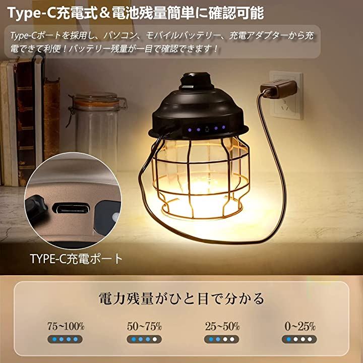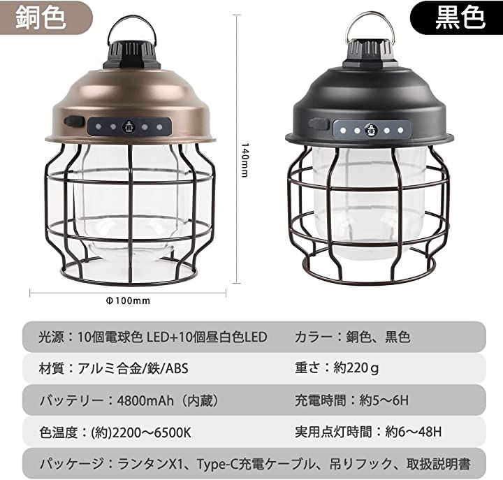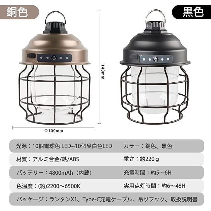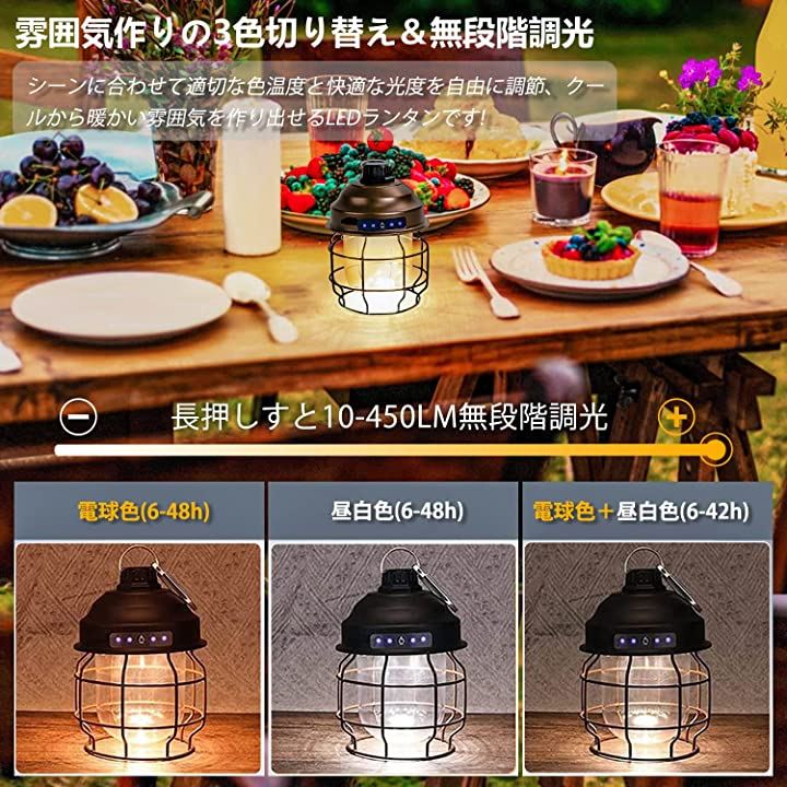 ・「3色切り替え&無段階調光」LEDランタンの光源の色は、温もりのある「暖色」、優しい「昼光色」、「暖色」+「昼光色」の3モードで調整でき、明るさも無段階で調整可能で、シーンに合わせて適切な色温度と快適な光度を自由に調節、レトロな雰囲気で、キャンプ、ピクニック、花見、ベッドルーム、喫茶店等におすすめです。