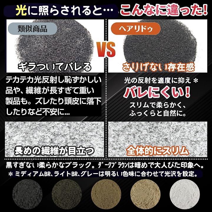 増毛パウダーと聞くと、ギラつき・テカテカ光るなど目立つイメージがありますが、ヘアリドゥは粒が小さく軽量なためふっくらとし、光の反射を抑えてバレにくいのも嬉しいポイントです。