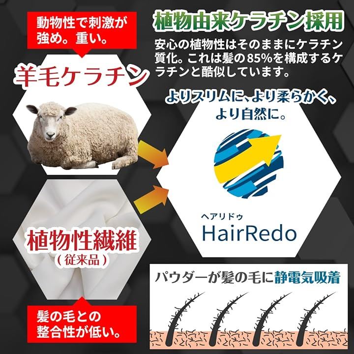 土に還る天然植物由来ケラチンファイバーを採用し、頭皮にも地球にも優しい増毛パウダーです。