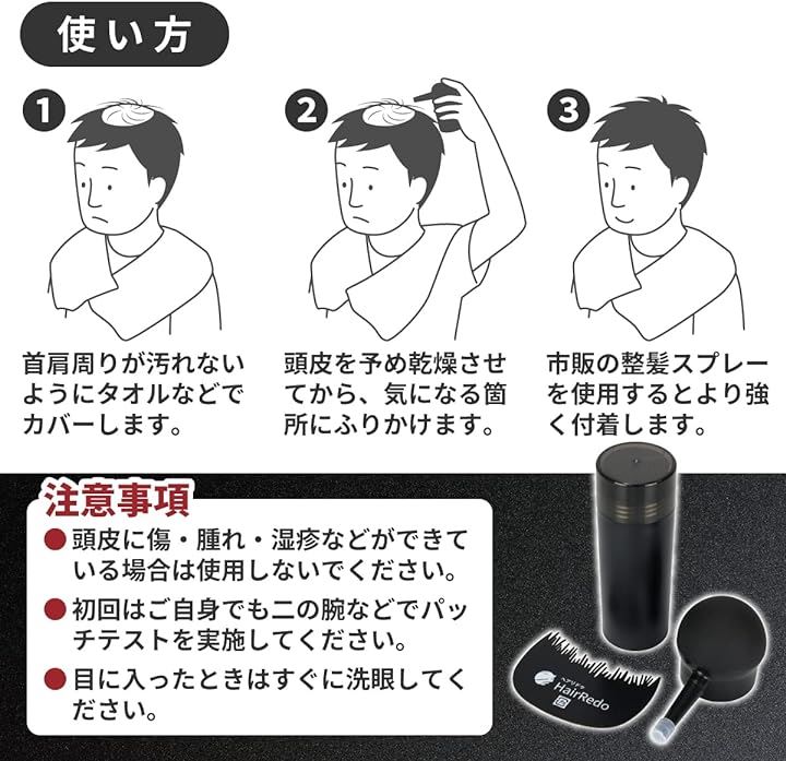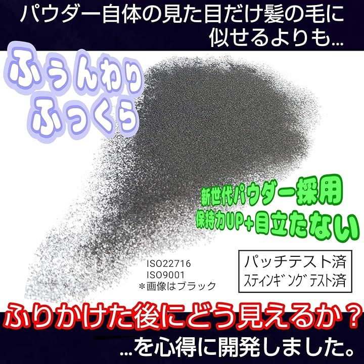 また、負電荷を帯びたパウダーと正電荷の髪の毛が引かれあい、静電気吸着する事で髪の毛1本1本を太く見せることでフサフサの頭皮に仕上げます。
