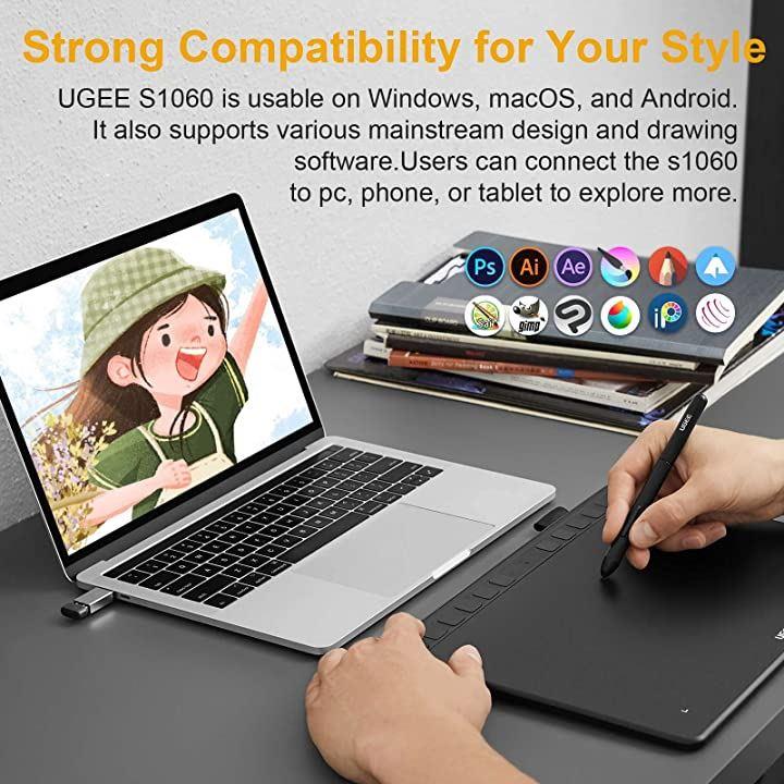 ・「幅広い互換性」UGEE S1060Wは、Windows 7/8/10/11、Mac OS X 10.10 (またはそれ以降のmacOS 12.01)、Android 6.0 (またはそれ以降)、Chrome OS 88 (またはそれ以降)、Linuxの5つのシステムと互換性があります。