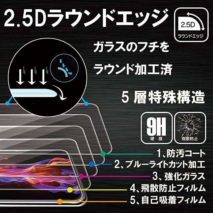 5層のレイヤー加工で硬度9H、国産AGCガラスで、鋭利な傷から保護、飛散防止加工でガラスの飛び散りを防ぎ液晶破損とケガから保護。