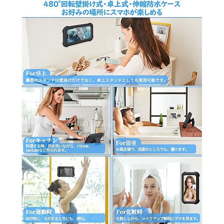 ・「卓上&壁掛けの2 in 1スタンド」 お風呂でもスマホを自由に使えます。 高さ調節可能、伸長距離5cm、480°回転。
