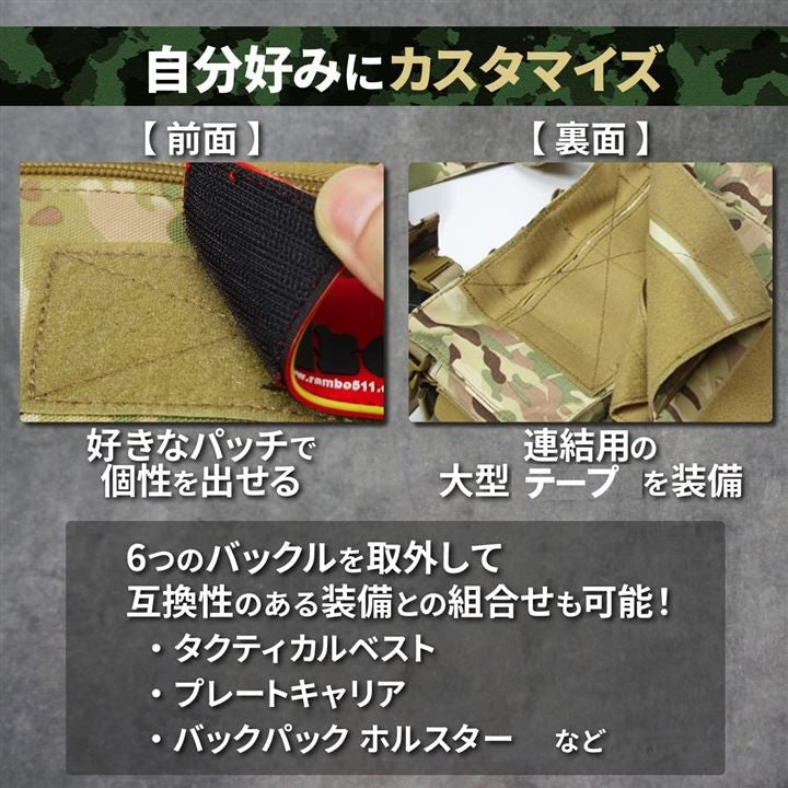 ・「他の装備との組み合わせも可能」背面には、取り外し可能で大きな 面ファスナーテープを採用しており、6つのバックルを取り外して、互換性のあるタクティカルベスト プレートキャリア チェストリグ バッグパック ホルスター など他の装備と組み合わせていただくことも可能です。