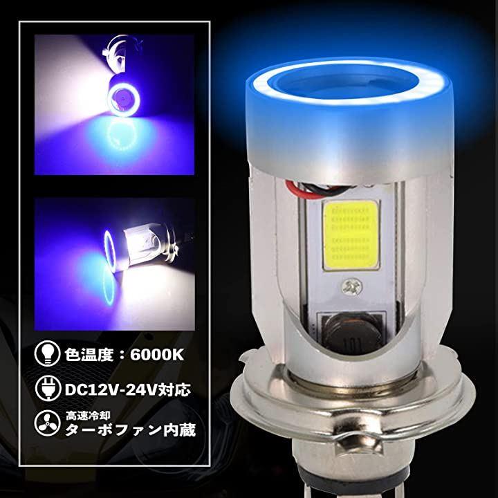 「互換品」TOMIRE バイク H4 LED ヘッド ライト バルブ HS1 Hi Lo 高輝度 COB チップ 高速 冷却 ファン イカリング エンジェルアイ 直流 DC 12V 24V 汎用 6000K ブルー 青 |