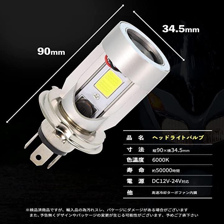 「商品スペック」 口金:H4対応 色温度:6000K 寿命:約50000時間 電源:直流 DC12-24V対応