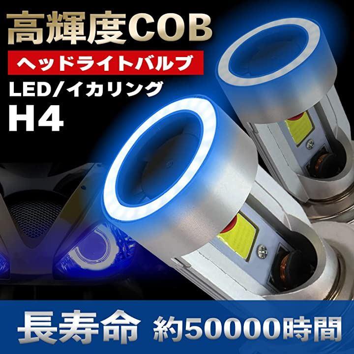 高輝度COB LEDチップを採用した明るさ抜群のH4LEDヘッドライトバルブで、ブルーのイカリング(エンジェルリング)でインパクトのあるカスタム感を味わえます。