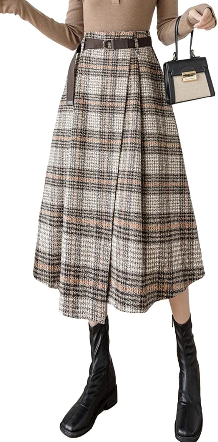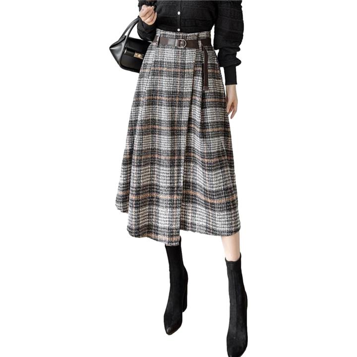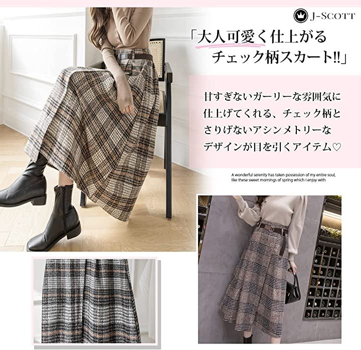 [J-Scott] [ジェイスコット] アシンメトリー フレアスカート ミモレ丈 グレンチェック柄 ハイウエスト ツイード ベルト付き |