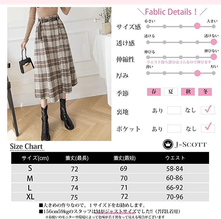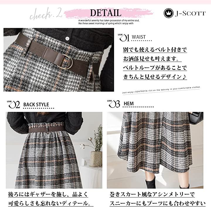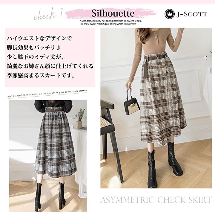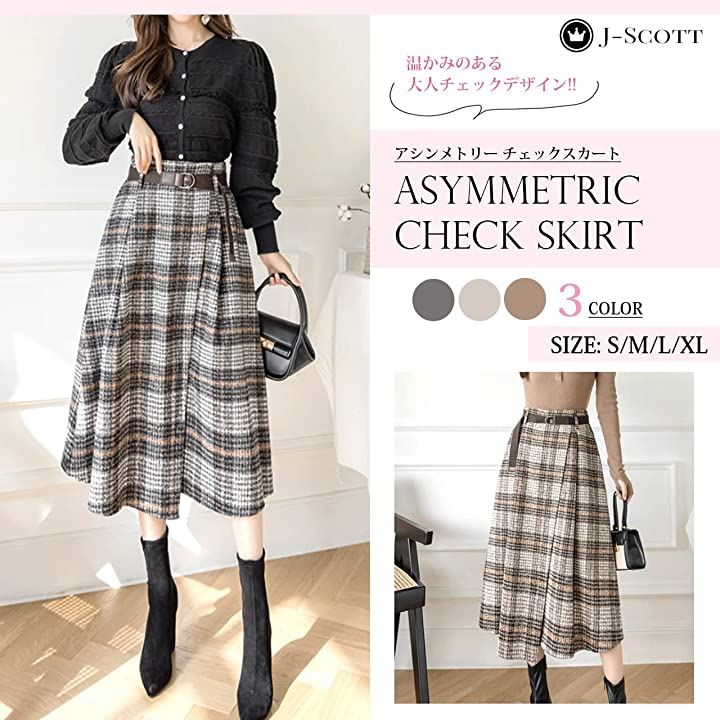 ・「秋冬にぴったり」 あったか生地で季節を楽しめる 大人可愛いチェック柄スカートの登場です。 温かみのある大人チェックデザイン&アシンメトリーのミディ丈で コーディネートの主役に使えるアイテムです。