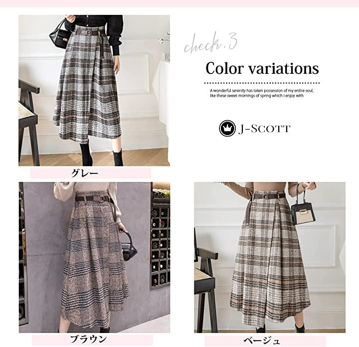 ・「カラーバリエーション」 カラーは、秋冬にぴったりのグレー・ベージュ・ブラウンの3色* チェック柄の中に複数の色を使用しているので、どんなカラーのトップスやシューズとも合わせやすいスカートです。