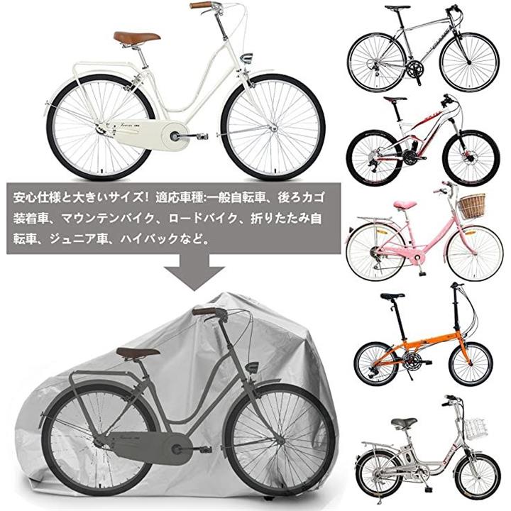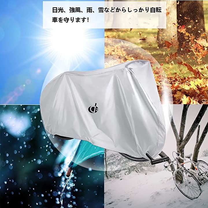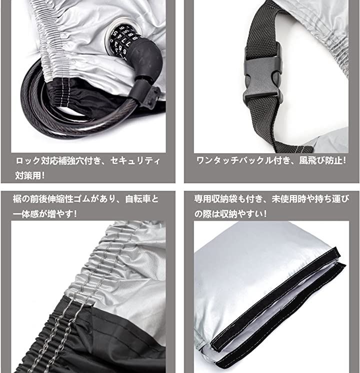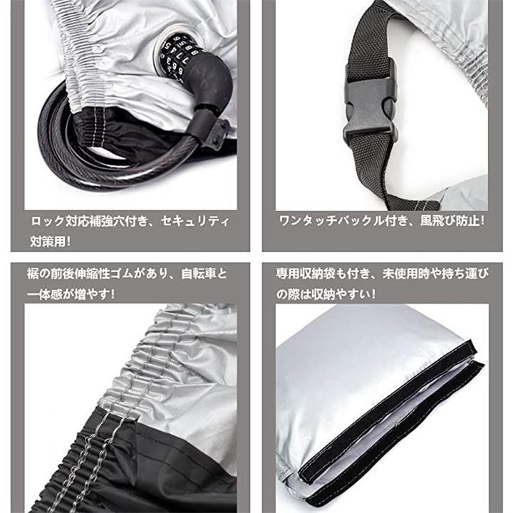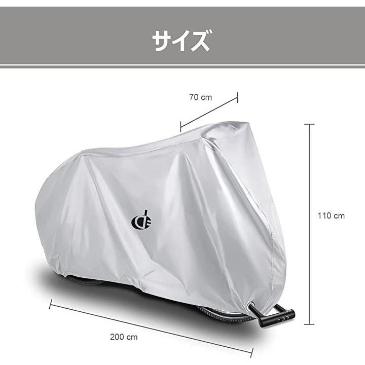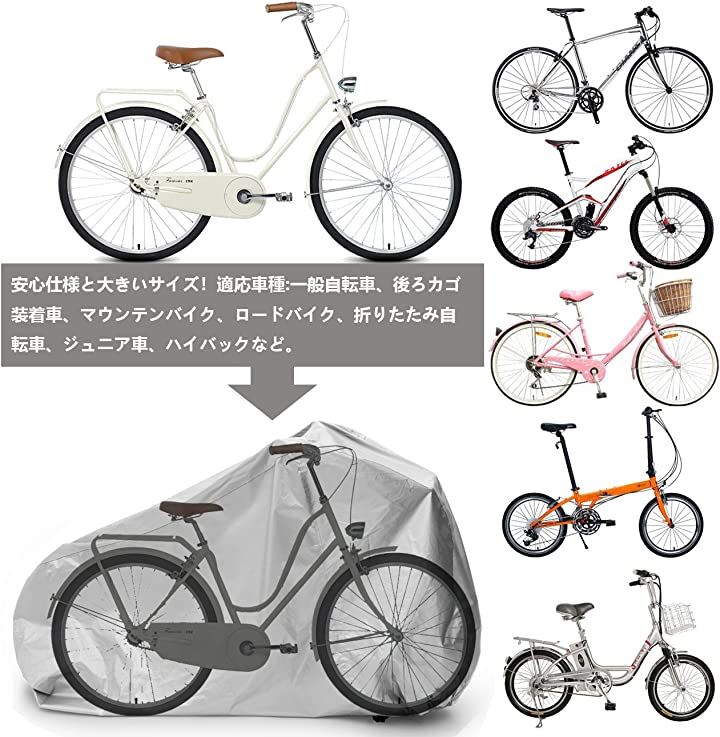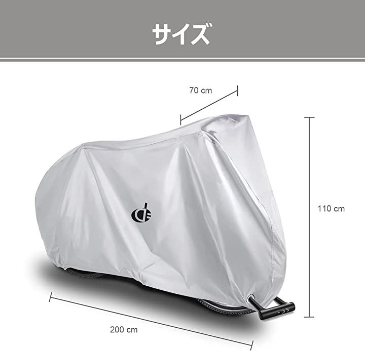 「高い包容力、大きめサイズ」カバー寸法:約200cmx110cmx70cm適応車種:一般自転車、後ろカゴ装着車、マウンテンバイク、ロードバイク、折りたたみ自転車、ジュニア車、ハイバック、子供乗せ自転車(一部)、29インチまでの自転車対応できます。