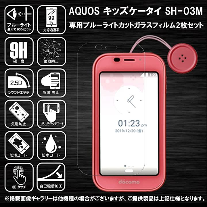 ・「対応機種」docomo AQUOS キッズケータイ SH-03M 「仕様」国産AGC旭硝子を使用 ブルーライトカット90%~93% 高透過率99% 表面硬度9H 薄さ0.33mm 2.5Dラウンドエッジ加工 指紋防止 防汚コート 飛散防止処理 自動吸着 3Dタッチ感度対応。