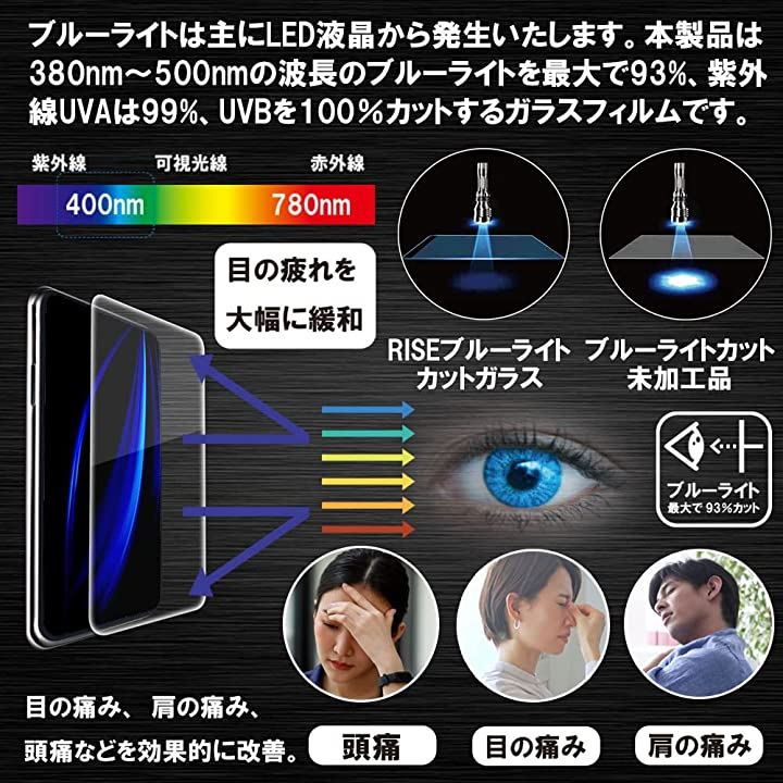 「ブルーライトを最大で93%カット」本製品は380nm~500nmの波長のブルーライトを最大で93%、紫外線UVAを99%、UVBを100%カットする素材を使用したガラスフィルムです。