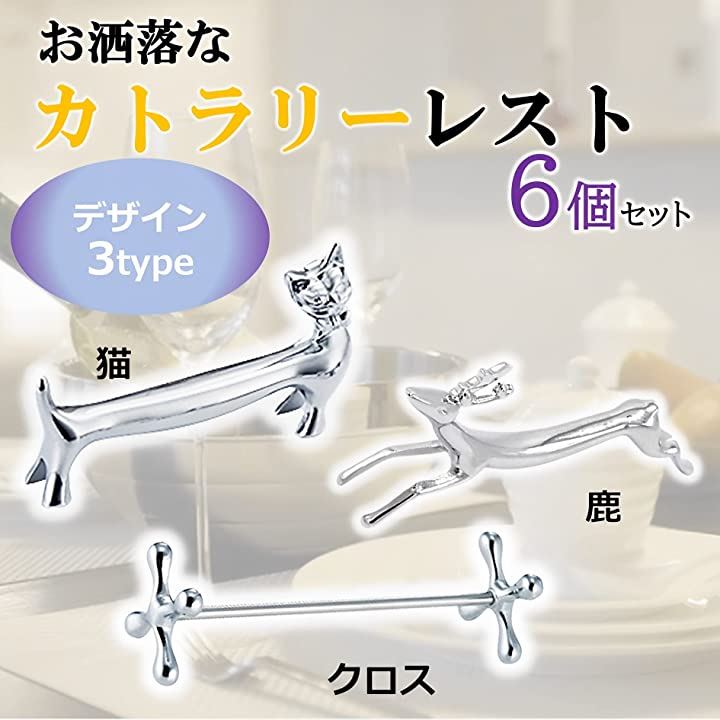カトラリーレスト 6個セット 卓上 洋食 記念日 箸置き フォーク 金属 鹿 猫 クロス ナイフ スプーン カラトリー