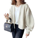 ニューネ パール付き カーディガン シンプル ビーズ レディース リブニット パフスリーブ バルーン袖 ビッグシルエット ガウン