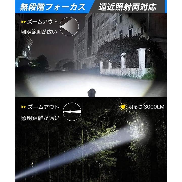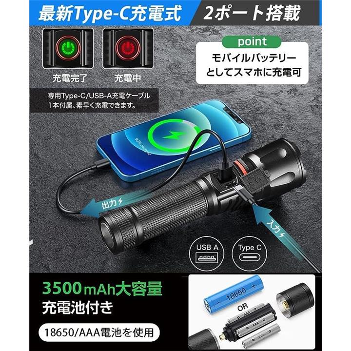 梱包内容: 懐中電灯本体x1、 18650リチウム電池x1、18650電池用ホルダーx1、単4電池用ホルダーx1、Type-C充電ケーブルx1、ストラップx1、日本語取扱説明書x1。