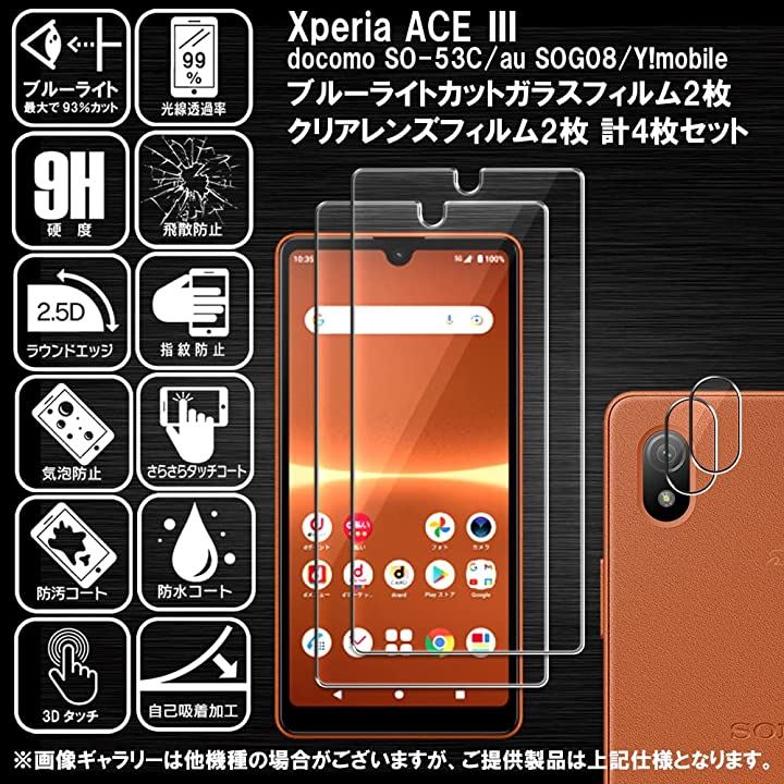 ブルーライトカット 93%2枚+2枚 RISE ガラスフィルム カメラ レンズ Xperia ACE III/Xperia docomo SO-53C/au SOG08/Y.mobile 用 保護フィルム