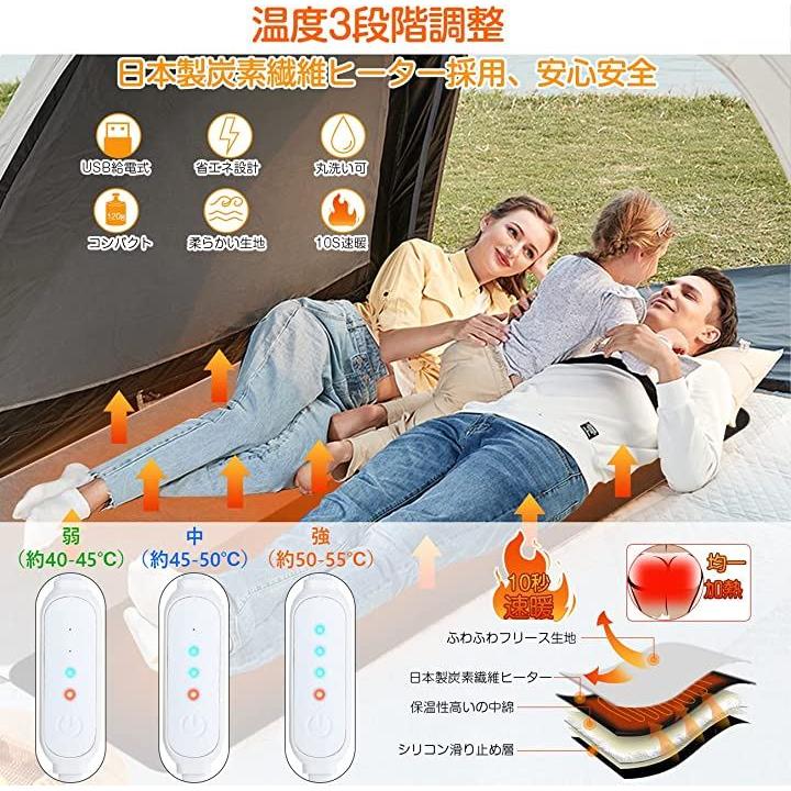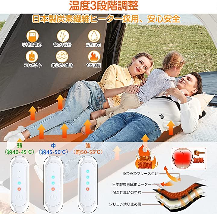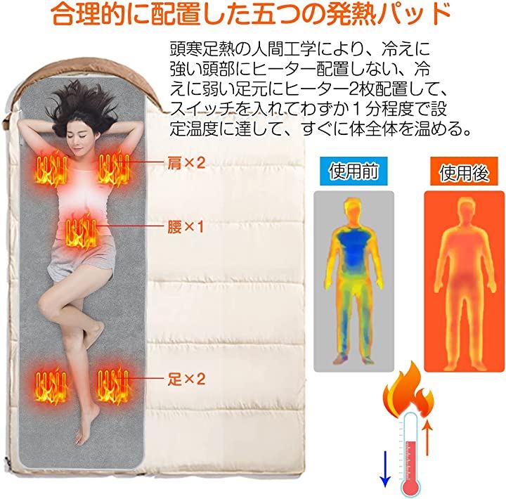 ・「五つヒーター・温度3段階調整・10秒速暖寝袋用電熱パッド」頭寒足熱の人間工学により、肩部x2、腰部x1、足元x2という合理的に配置した5つヒーター内蔵、耐久性の高い日本製炭素繊維ヒーター採用、10秒速暖、均一加熱。