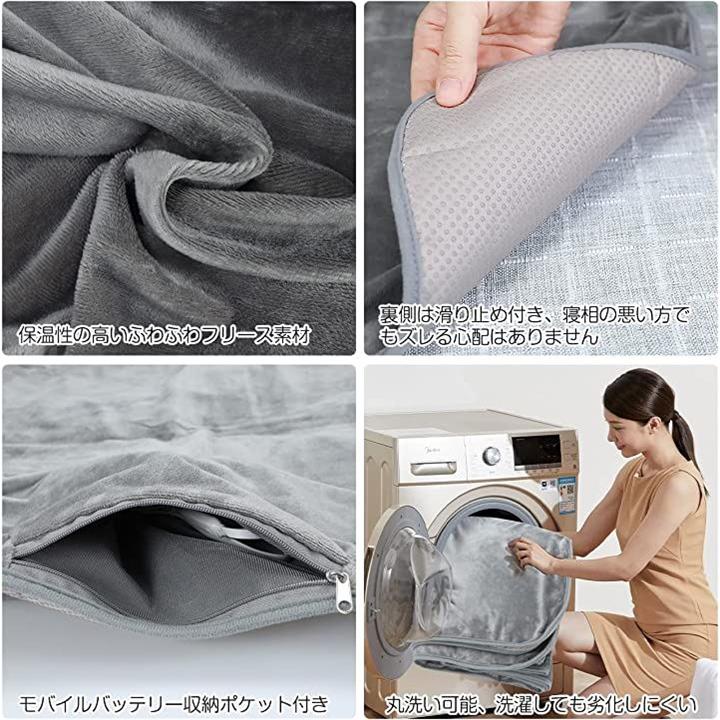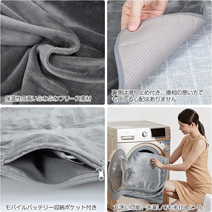 電熱パッド表面は保温性の高いフリース生地採用、肌に優しい触感で心地よく。裏側は滑り止め加工がされている、寝相の悪い方でもズレる心配はありません。