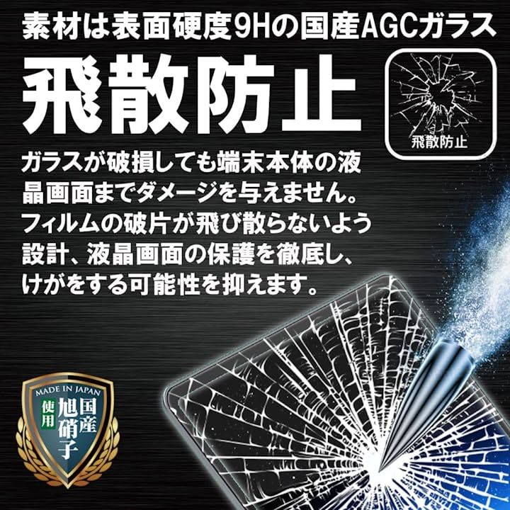 「飛散防止」国産AGCガラス9H硬度、素材に日本製ガラスを使用、飛散防止加工を行っておりガラスが破損しても液晶までダメージを与えません。