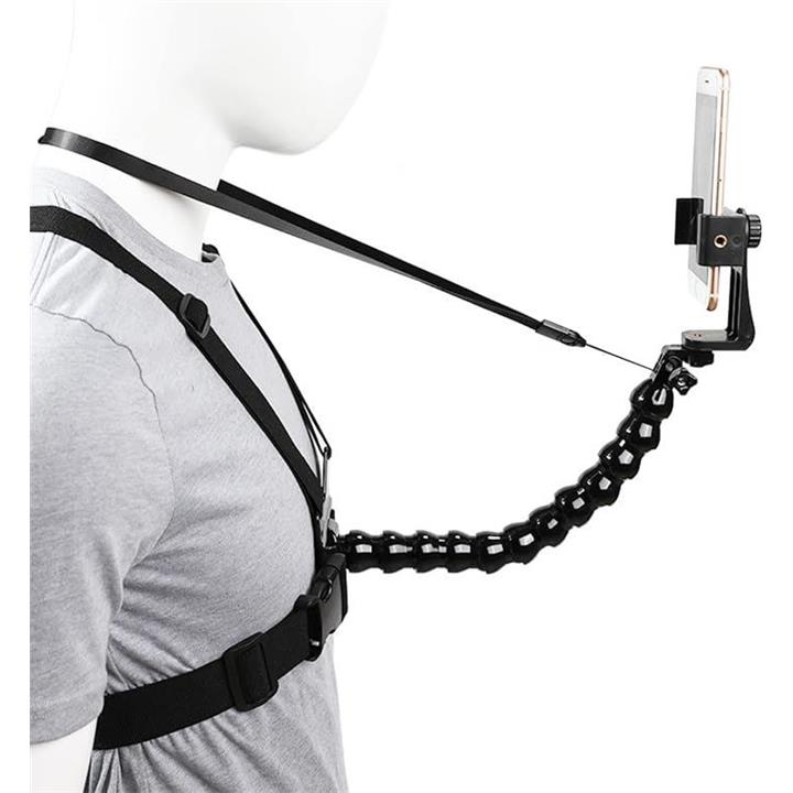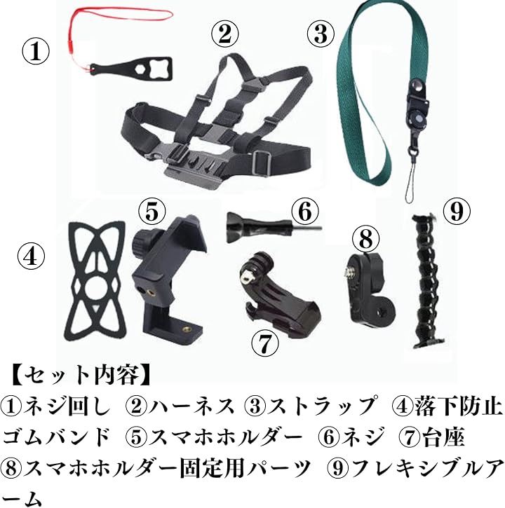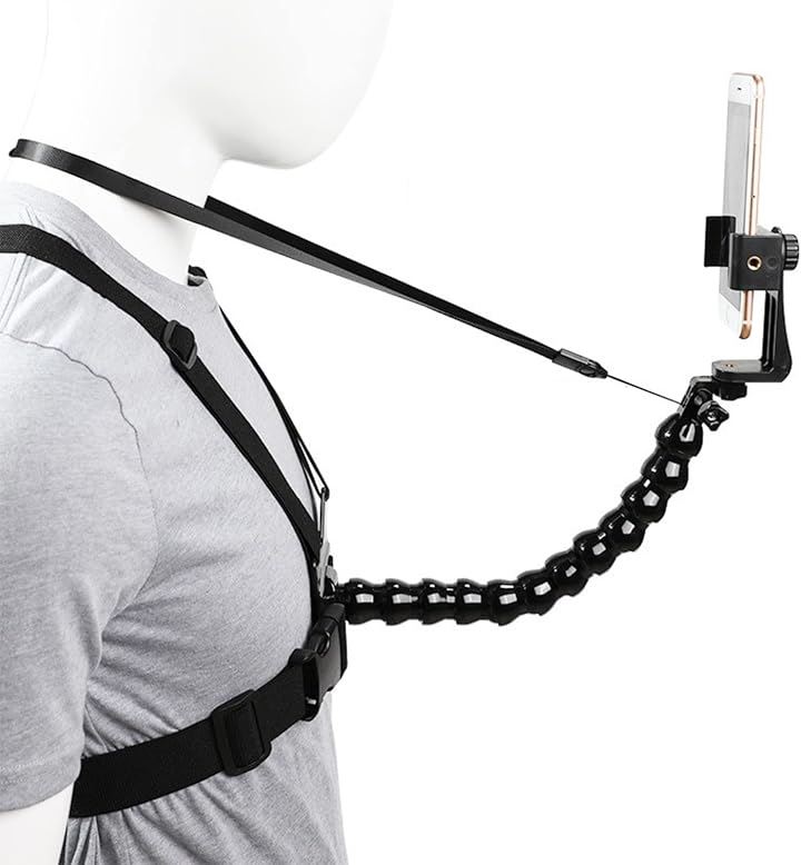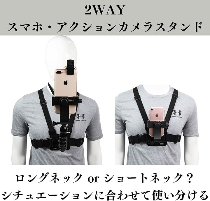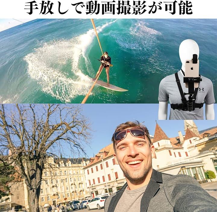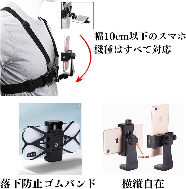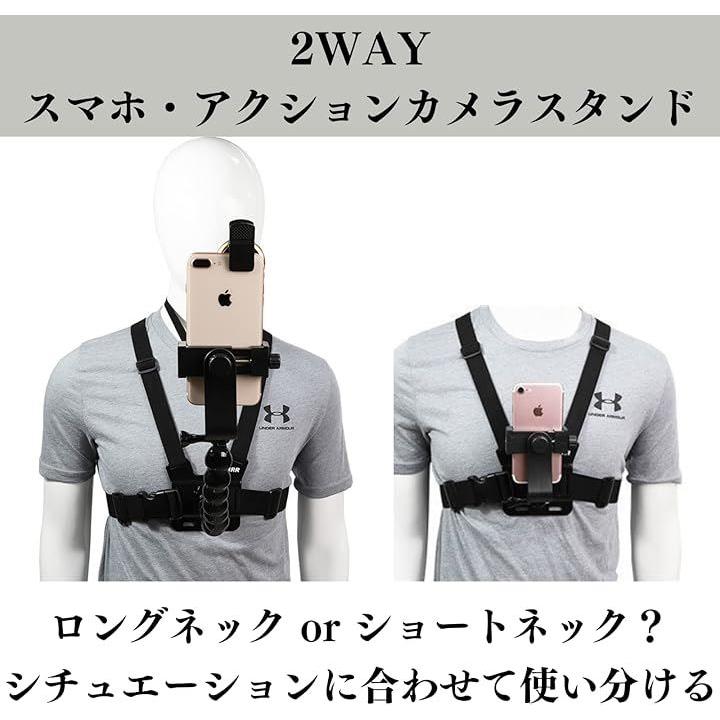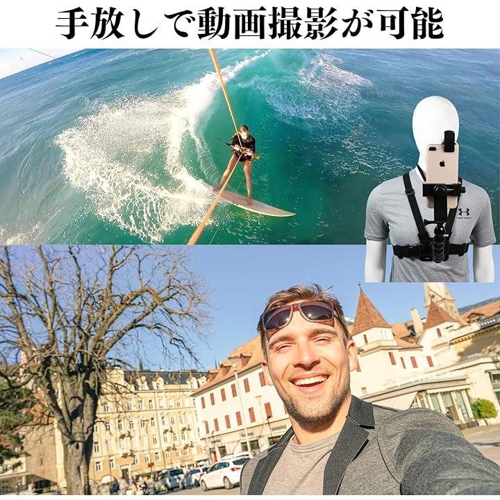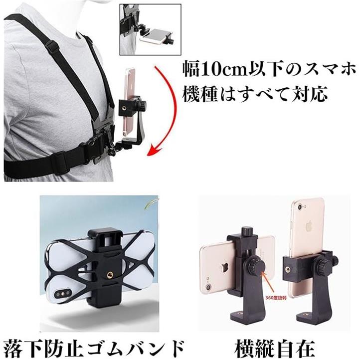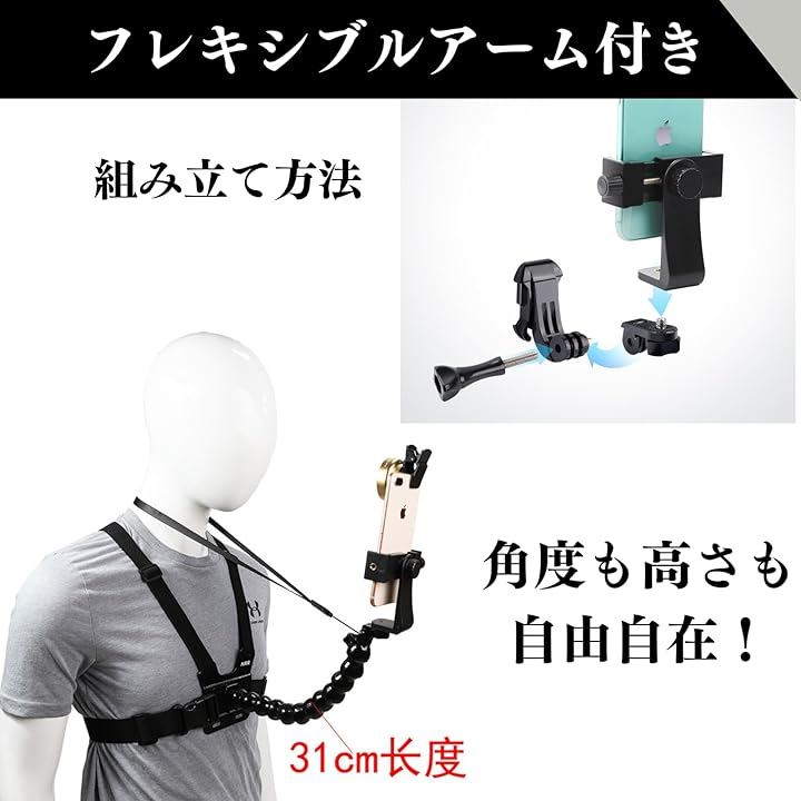 スマホ アクションカメラ マウント フレキシブルアーム チェスト ハーネス ホルダー 手ぶら動画撮影 自由に角度調整 落下防止ストラップ 滑り止め付き 縦・横撮影可能