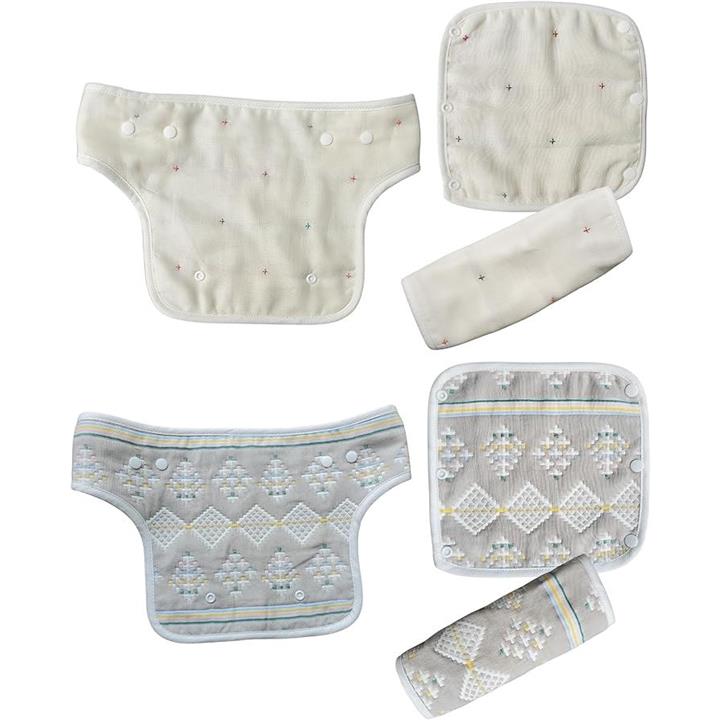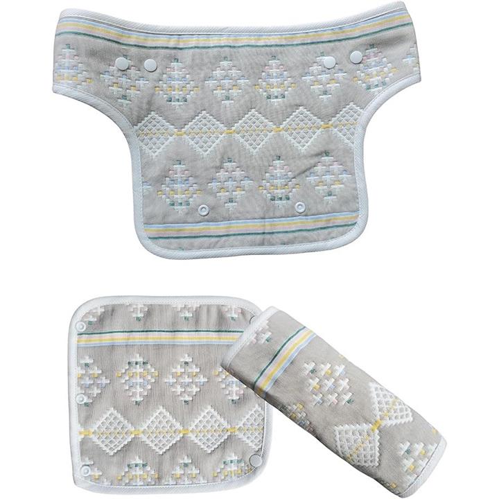 「お得なセット」この3枚セットには、胸当て付きのよだれカバーが含まれており、さらにオマケとして便利なアイテムが付属。