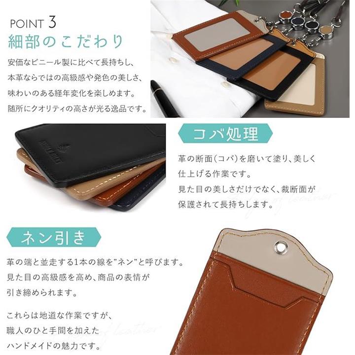 「Spec」 *素材 本体:本革(牛革) 透明フィルム:プラスチック、ストラップ紐:コットン *仕様 クリアポケットx1、カードポケットx2 *サイズ 本体:縦 約 12.6cmx横 約 7.3cmx厚さ 約 0.5cm ネックストラップ:全長 約 53cm(金具含む) *重さ:約 48g「Color Variation」 BlackxCamel:きりっと凛とした品格が漂うブラックキャメル。