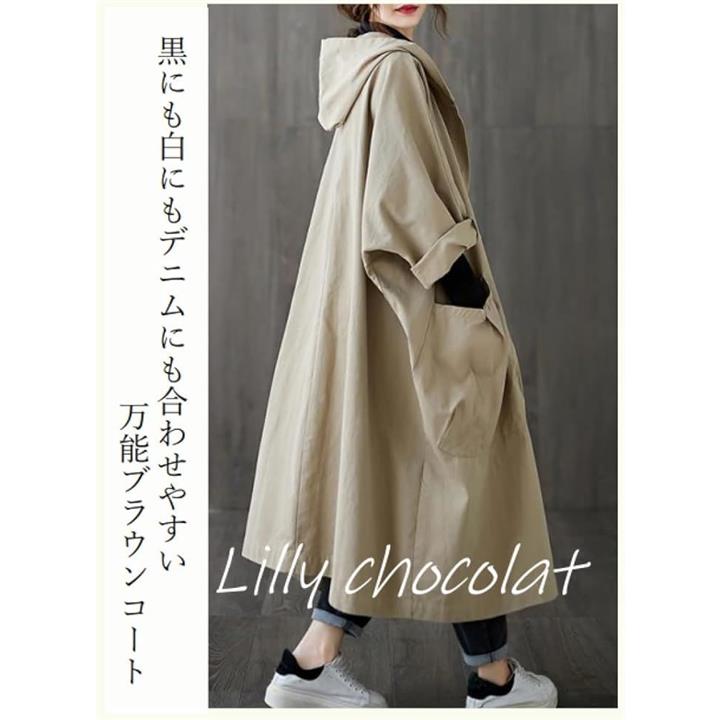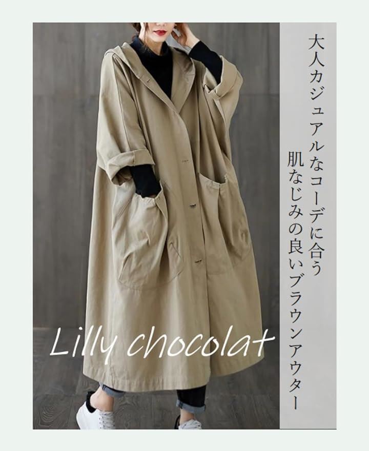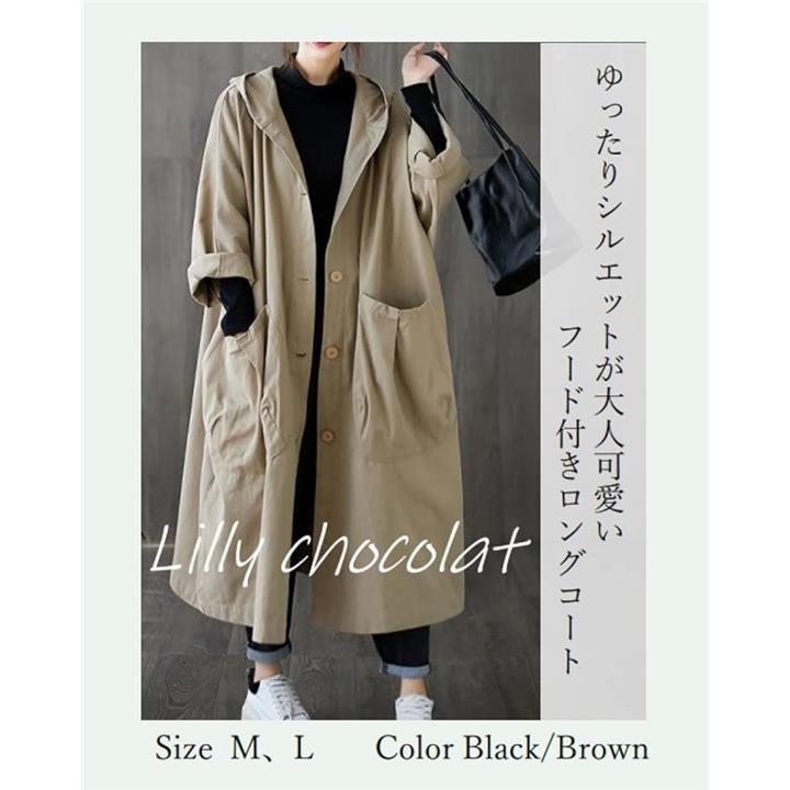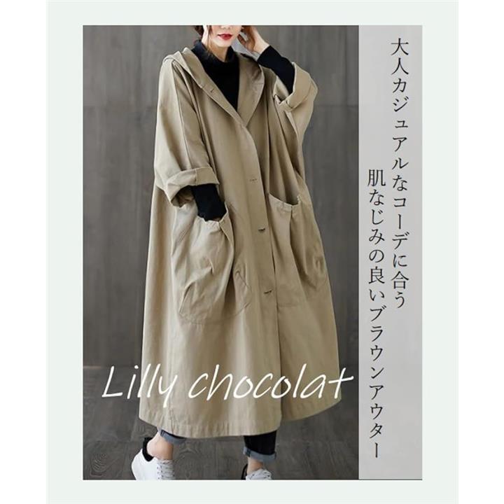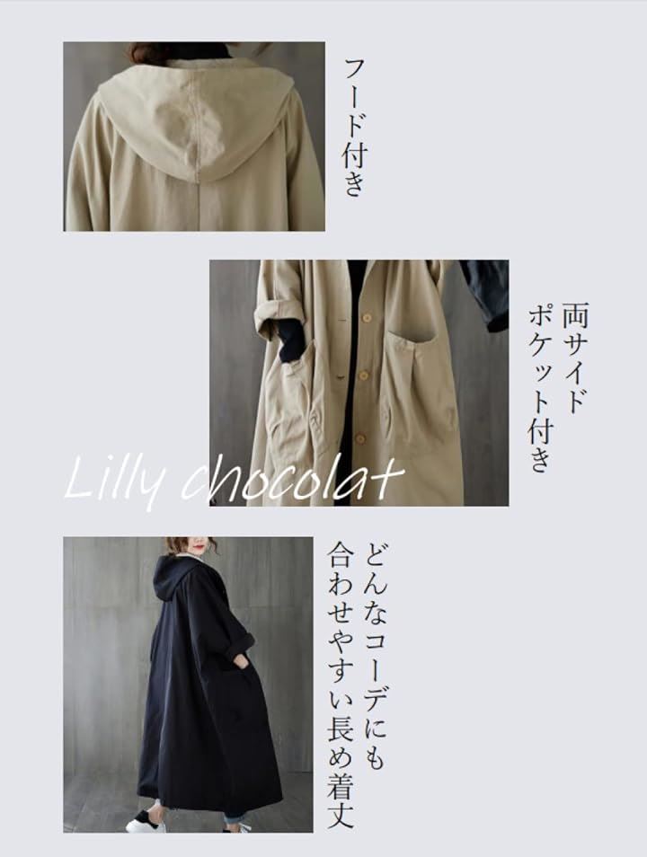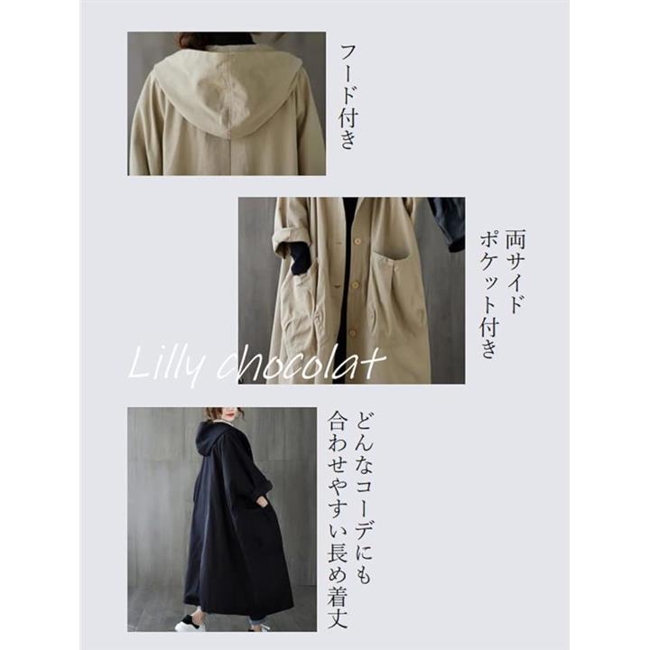 リリー ショコラ ロングコート レディース 春 カジュアル アウター 上着 羽織もの ステンカラー 薄手 ポケット ボタン フード付き シンプル 動きやすい