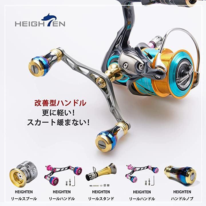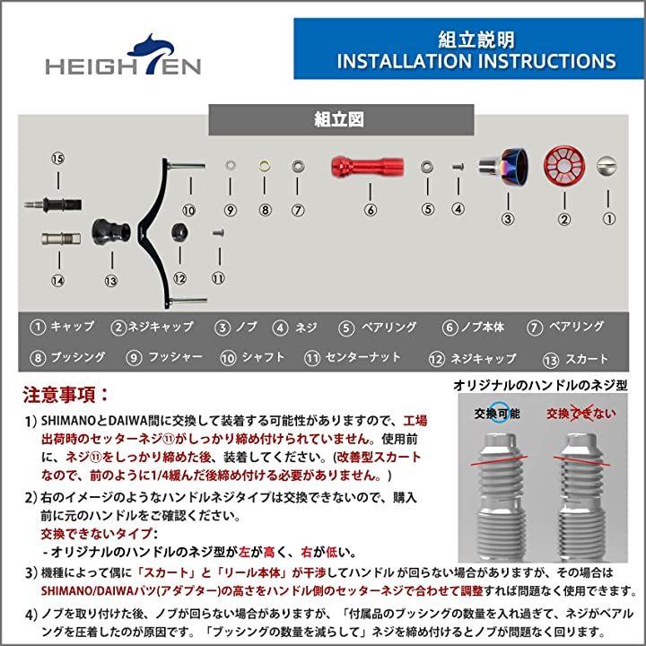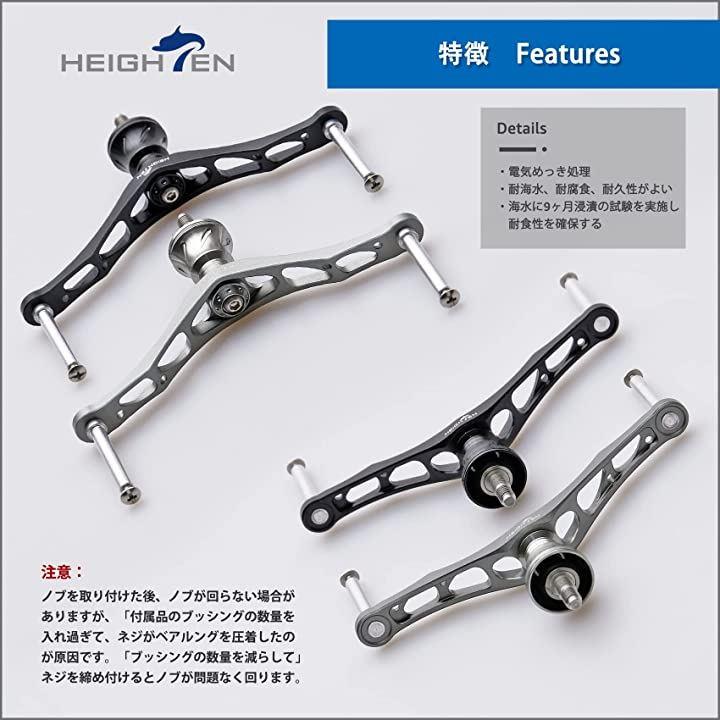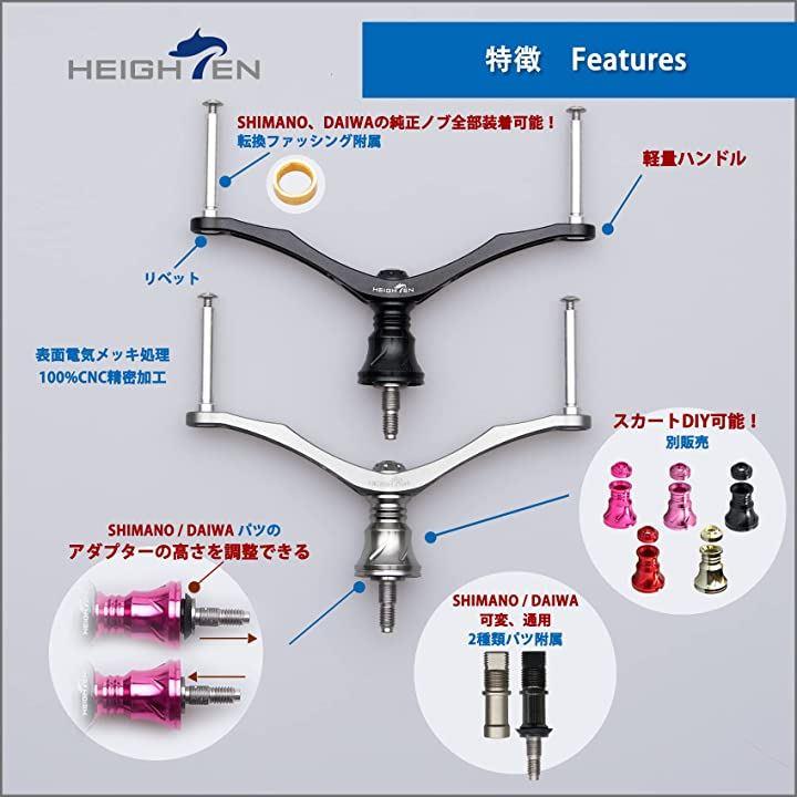 HEIGHTENリールハンドル高精度CNCマシンカット加工高品質70シリーズアルミニウム素材で軽く、強く仕上がっているダイワ(Daiwa)とシマノ(Shimano)に取り付けが可能人体工学と滑り止め設計でグリップ感が体感できる、質感も良くハンドル部のステンレス材質ベアリングも精度良く回転、手にフィットするノブに変えることで、コントロール性能が上がり、一日中巻いても疲れない。