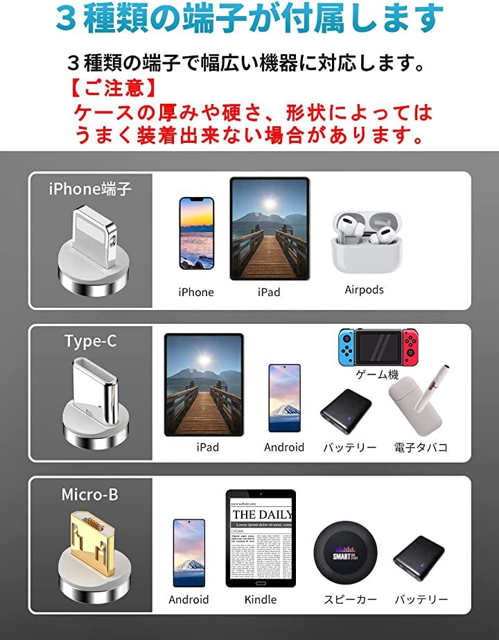 「互換品」[Magic Cable 540X] マグネット 充電ケーブル マジックケーブル 充電器 iPhone互換 USB充電ケーブル マグネットケーブル マグネット式 充電ケーブル TYPE C B iPhone互換端子 3.0 ケーブル |