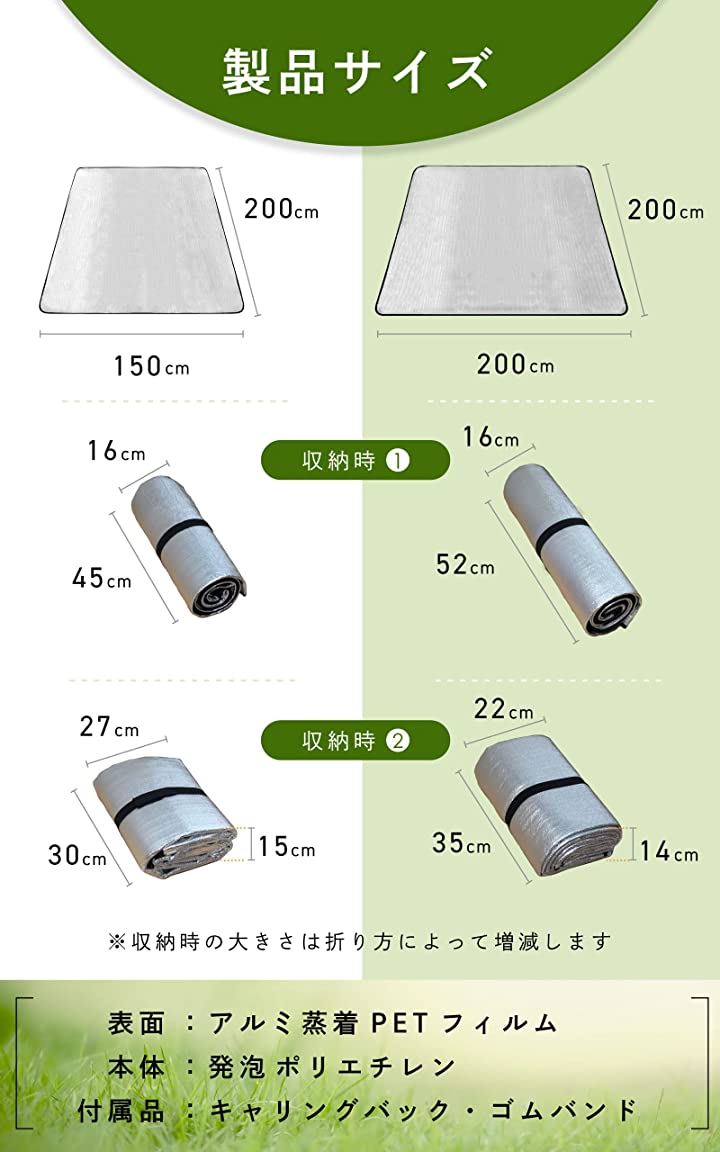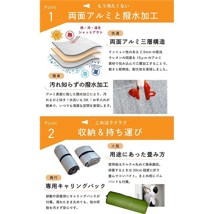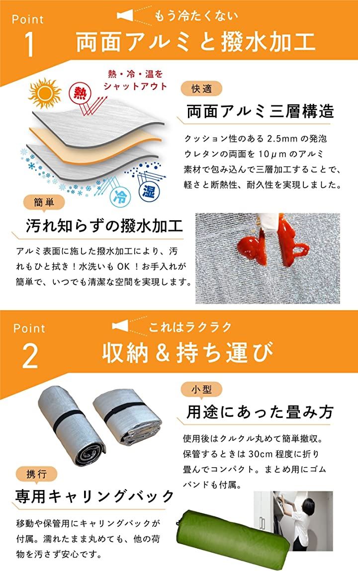 ・発泡ウレタンの両面にアルミを蒸着させた3層アルミ構造なので素材断熱性・保温性 すぐれており、地面からの冷気を遮断し、体温などの体の熱は反射します。