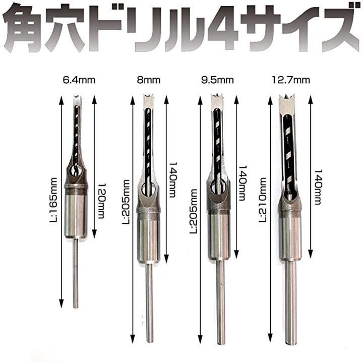 DIYの幅が広がる:趣味の木工や家具、建具製作に便利なホゾ穴(四角穴、長方形の穴))あけに便利なドリル6.4・8・9.5・12.7mmが各1本、4本セットになっております。